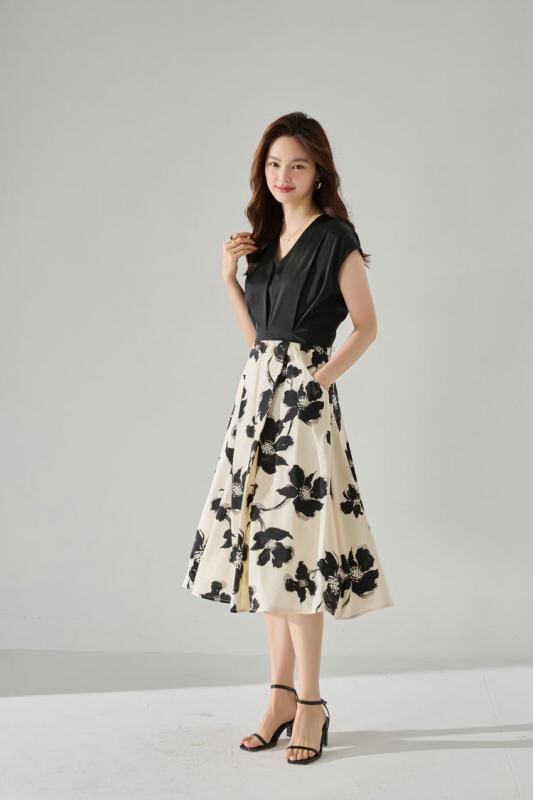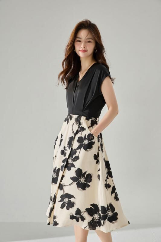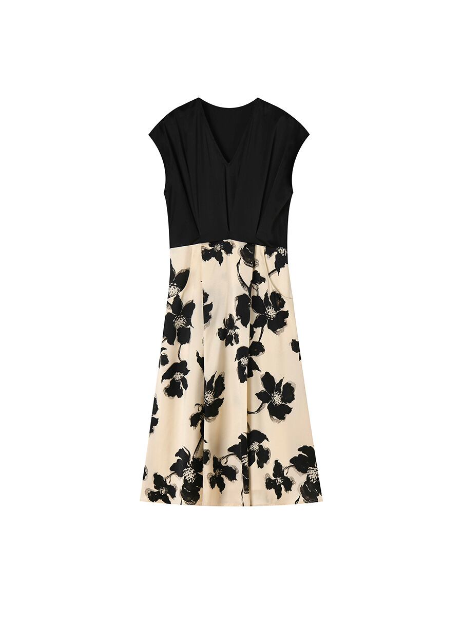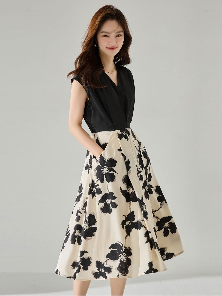 ワンピース 新チャイナ風 モダン 花柄 プリント 切り替え 細見え効果 上品 エレガント Vネック 半袖 ミディ丈 デイリー オフィス 通勤 ポリエステル素材 ブラック