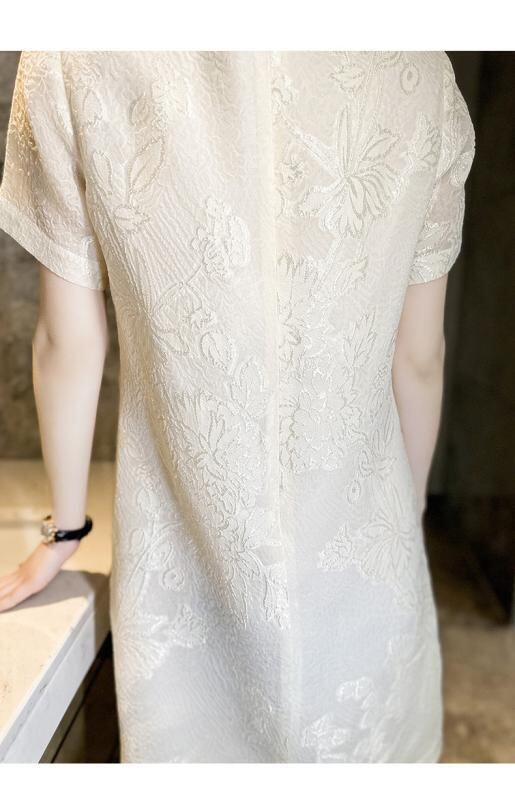ワンピース レディース 高級感 シルク ジャガード織り レース オリエンタル柄 半袖 ミディ丈 クルーネック Aライン 花柄 刺繍 ゆったり 通勤スタイル エレガント ホワイト