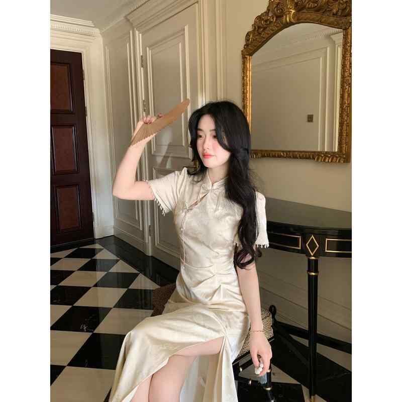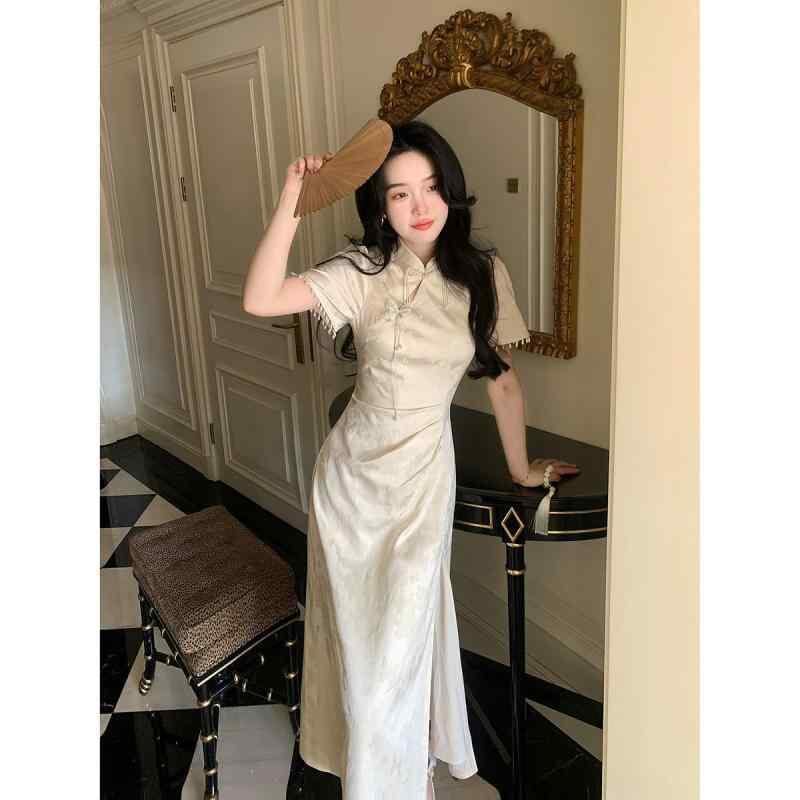 ワンピース 新チャイナ風 旗袍ドレス ジャカード織り スリット入り 半袖 ミディ丈 レトロデザイン Aラインシルエット ラウンドネック ポリエステル素材 上品 エレガント チャイナボタン オフホワイト
