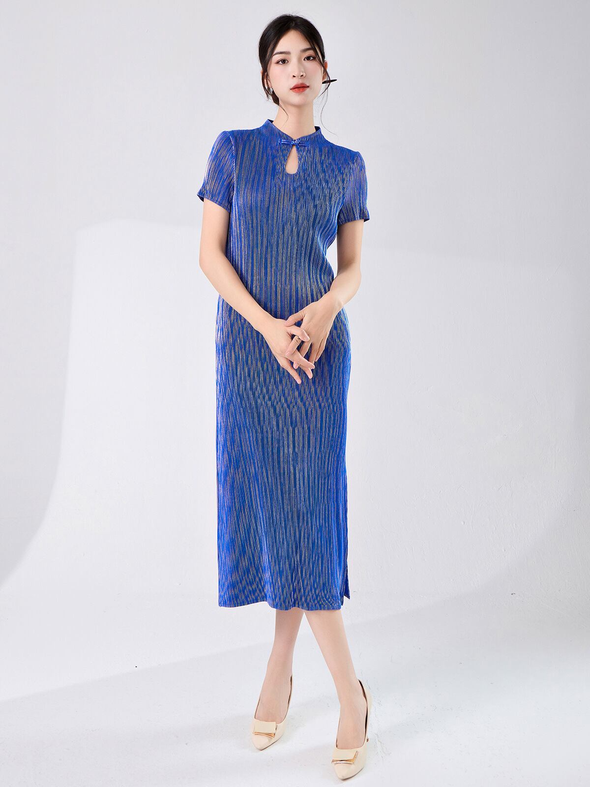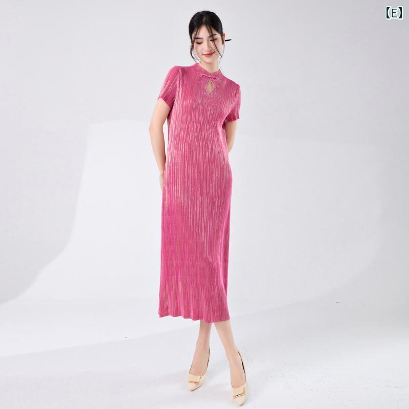 ワンピース 改良チャイナドレス 新中華風 ハイネック 半袖 スリット ミディ丈 Aライン プリーツ ハイウエスト ポリエステル 無地 エレガント レトロ