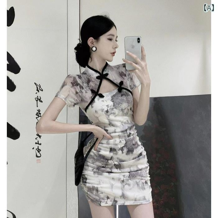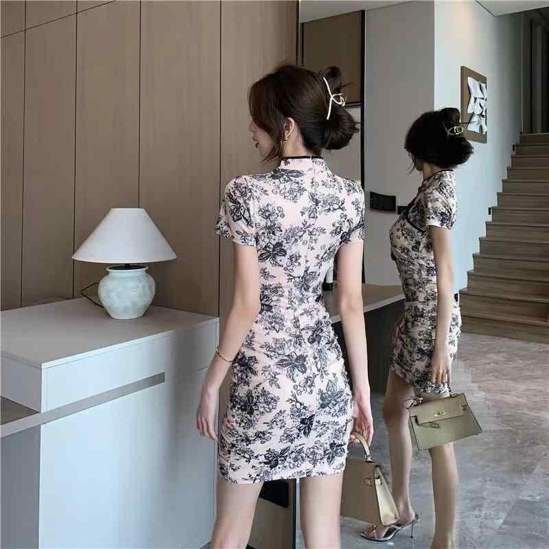 ワンピース レディース チャイナドレス風 ショート丈 ウエストマーク スタイルアップ 新中華風 レトロモダン エレガント フェミニン 綿 ポリエステル 花柄 総柄プリント ポロ襟 半袖