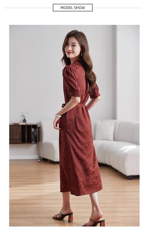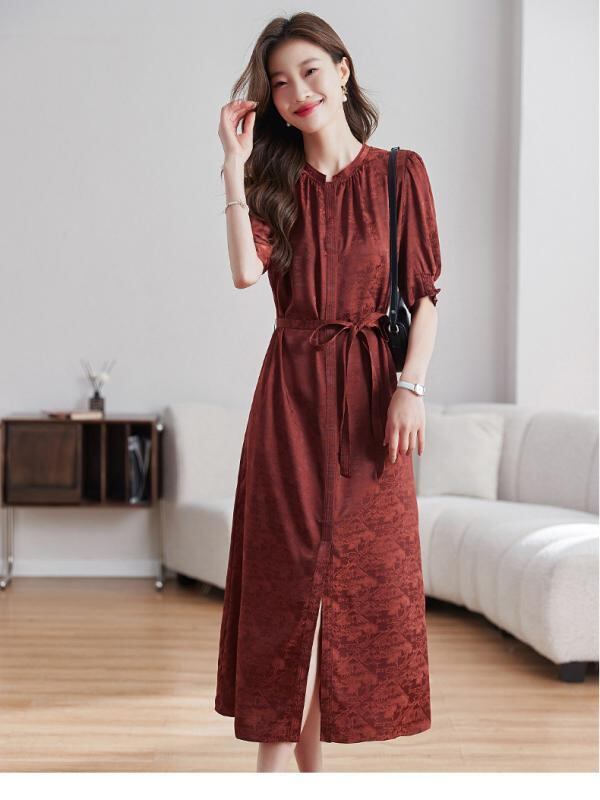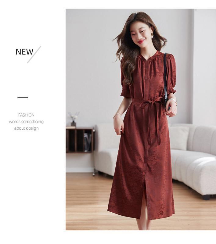 ワンピース レディース 新中式 ジャカード織り ロング丈 ラウンドネック 半袖 Aライン スリット 細見え エレガント きれいめ 通勤 オフィス カジュアル ポリエステル素材 花柄