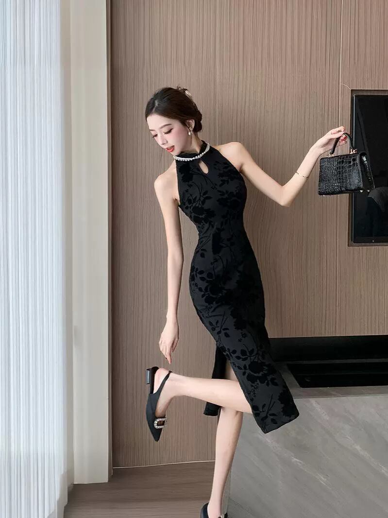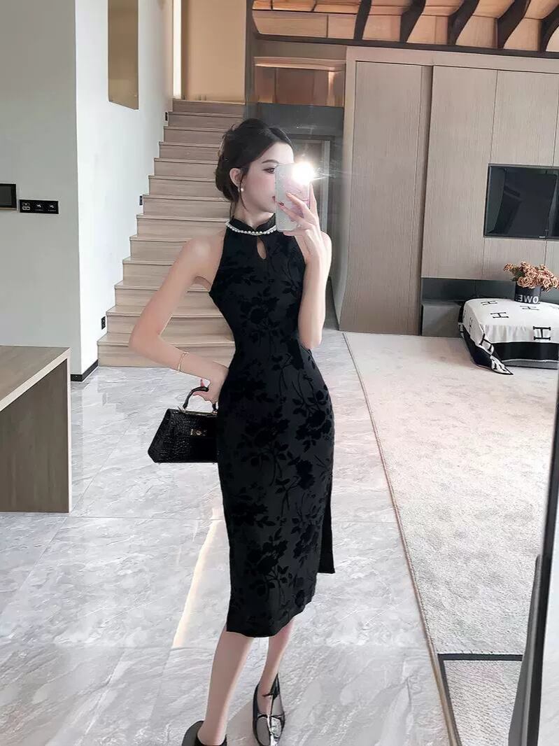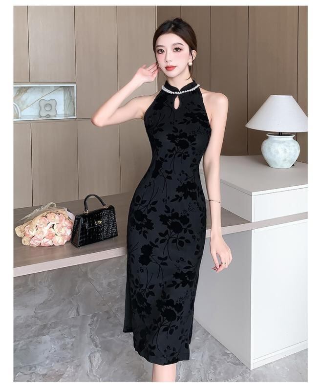 ・カテゴリ: ワンピース ・スタイル: エレガント、セクシー ・主な素材: ポリエステル95%以上、シフォン ・ネックライン: ハイネック ・袖丈: ノースリーブ ・ウエスト: ミドルウエスト ・スカート丈: ミディ丈 ・加工: 植毛 ・デザイン要素: ボタン ・タイプ: プルオーバー ・構成: 単品 ・カラー展開: ブラック ・サイズ展開: S、M、L、XL