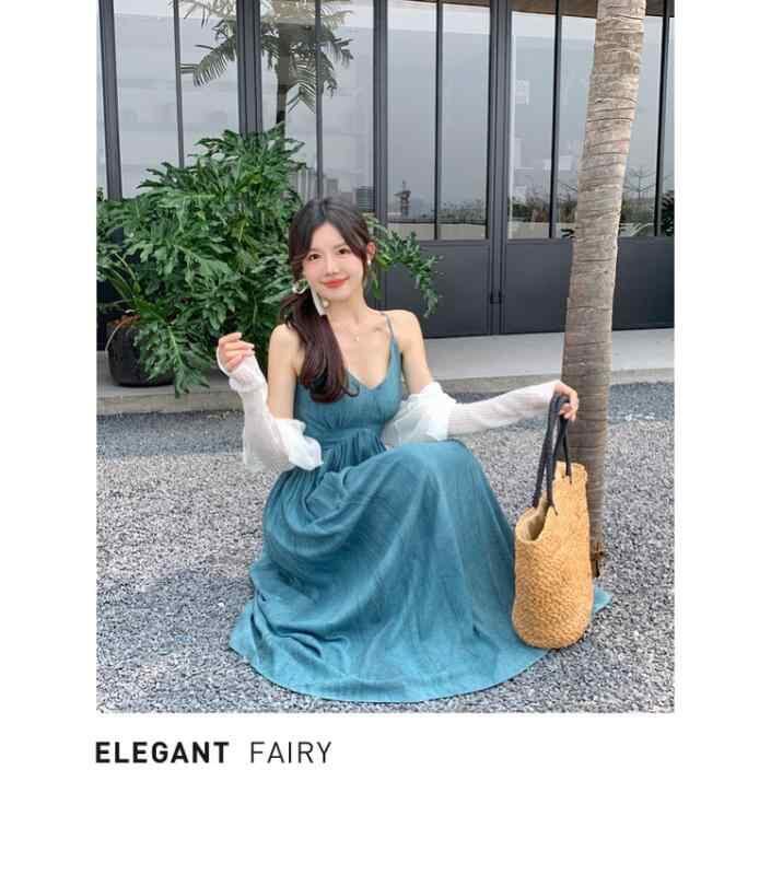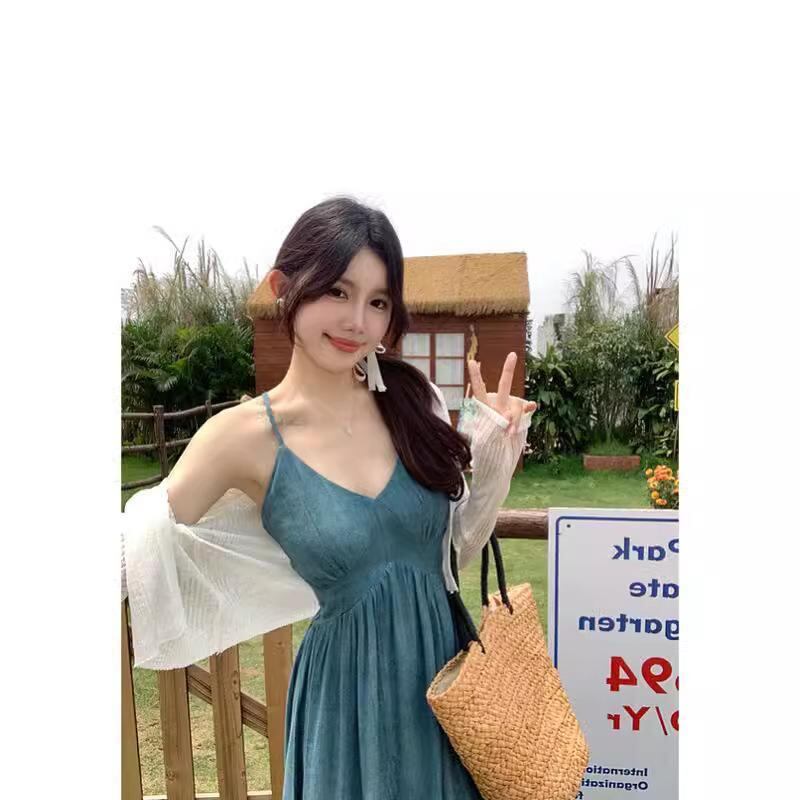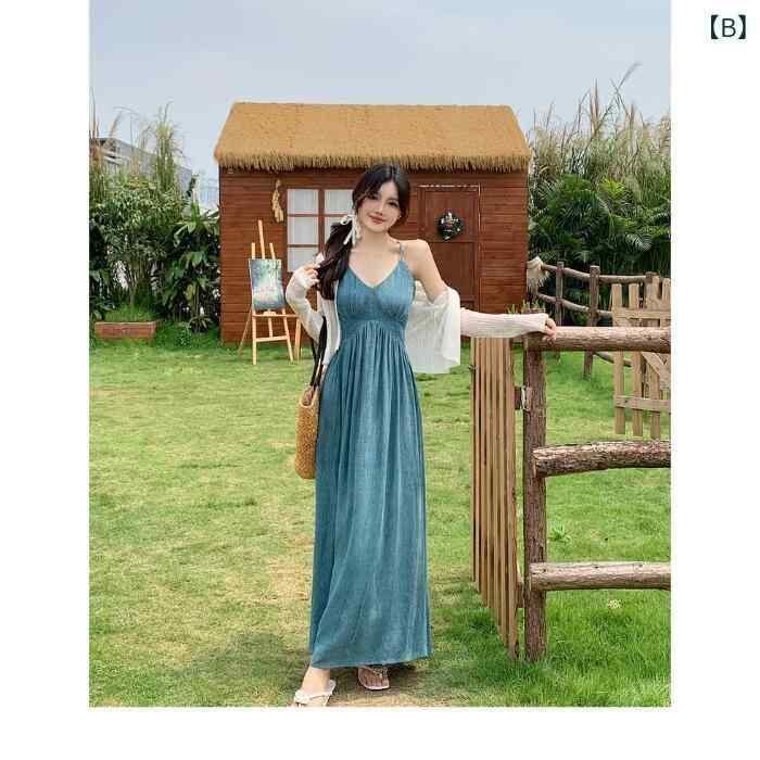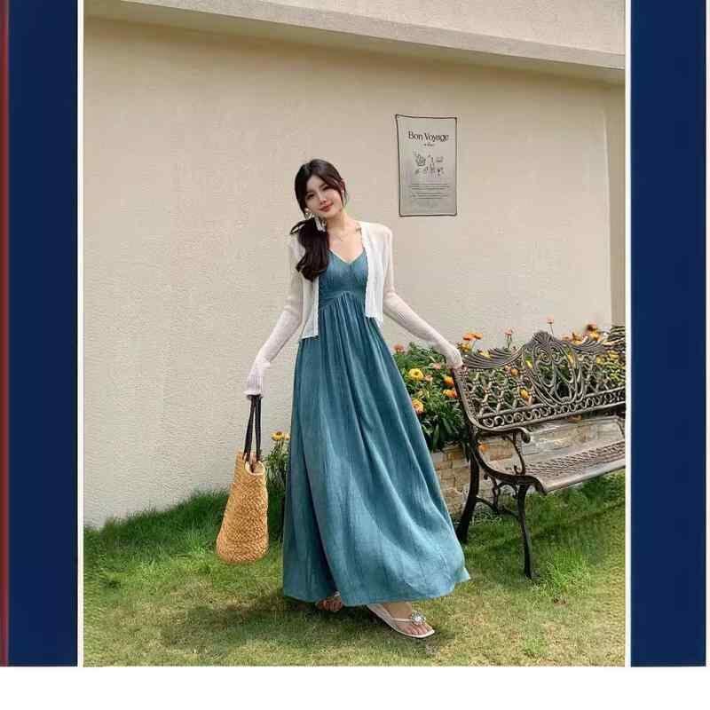 ワンピース レディース 大きいサイズ 中国風 新中式 チャイナモダン ウエストマーク ウエストシェイプ 着痩せ効果 スタイルアップ Aライン ロング丈 Vネック キャミソール ノースリーブ エレガント 上品 ポリエステル 幾何学模様 ブルー