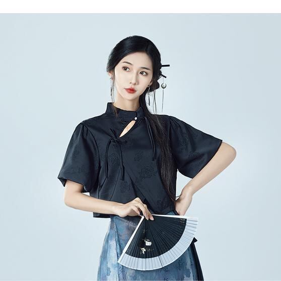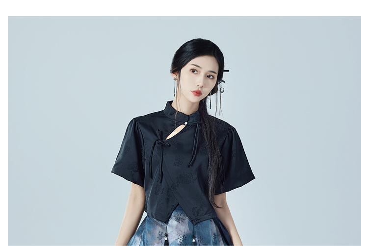セットアップ レディース 半袖トップス 黒 細見え 万能 新中華風 馬面スカート 黒藍 グラデーション 文字プリント 半身スカート ポリエステル カジュアル