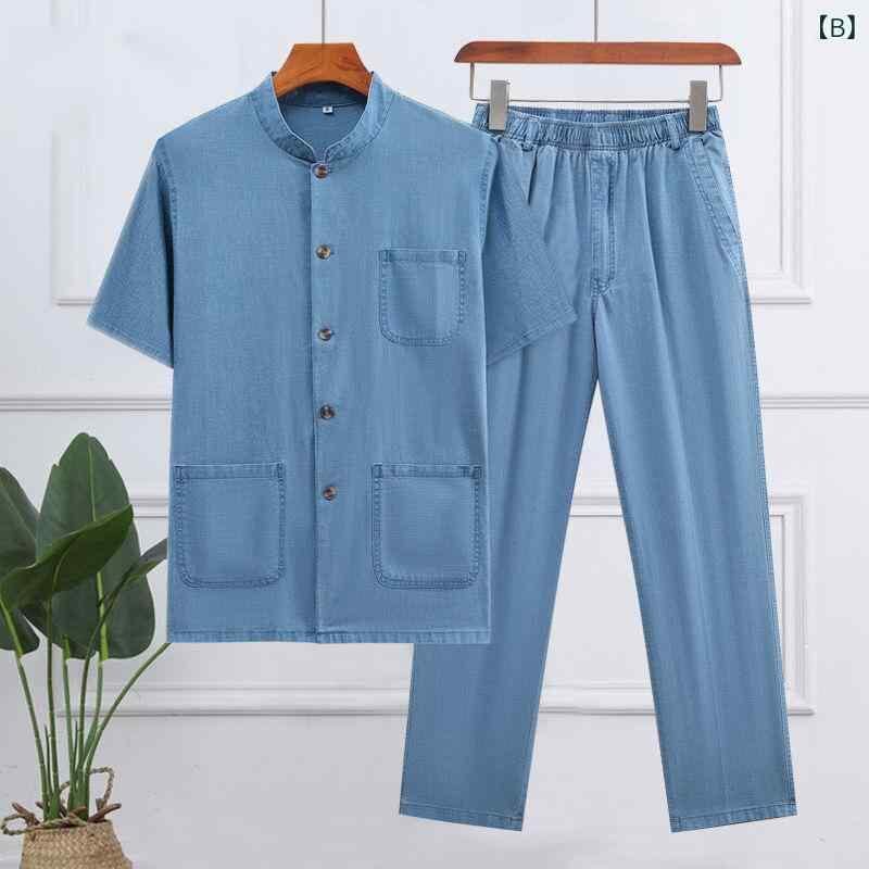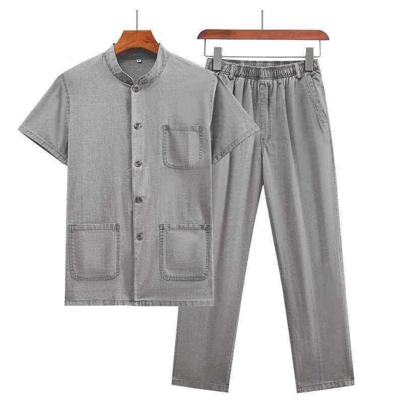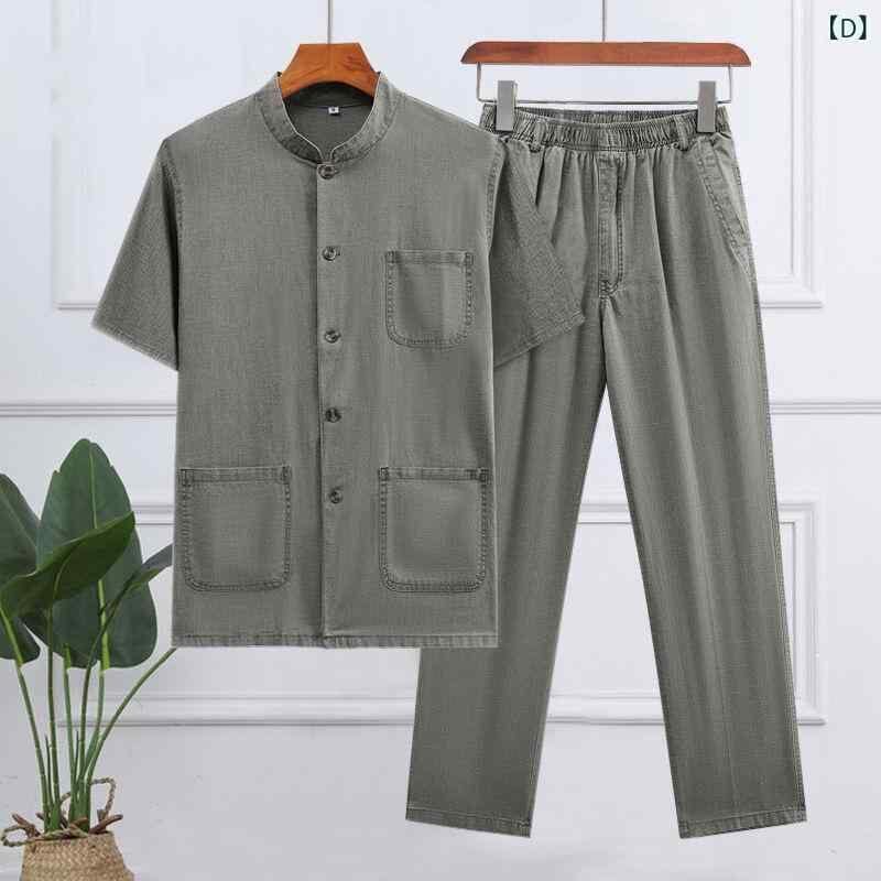 セットアップ メンズ シニア 男性用 中国風 唐装 チャイナ服 綿麻 コットン リネン 半袖 上下セット 夏 普段着 リラックスウェア カジュアル オリーブ デニムブルー ライトグレー ダークグレー