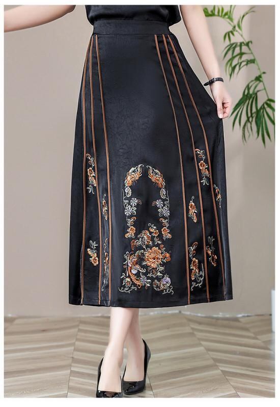 スカート レディース 大人女性 馬面スカート 中国風 刺繡 Aライン ミディ丈 エレガント 細見え 着痩せ ポリエステル ブラック