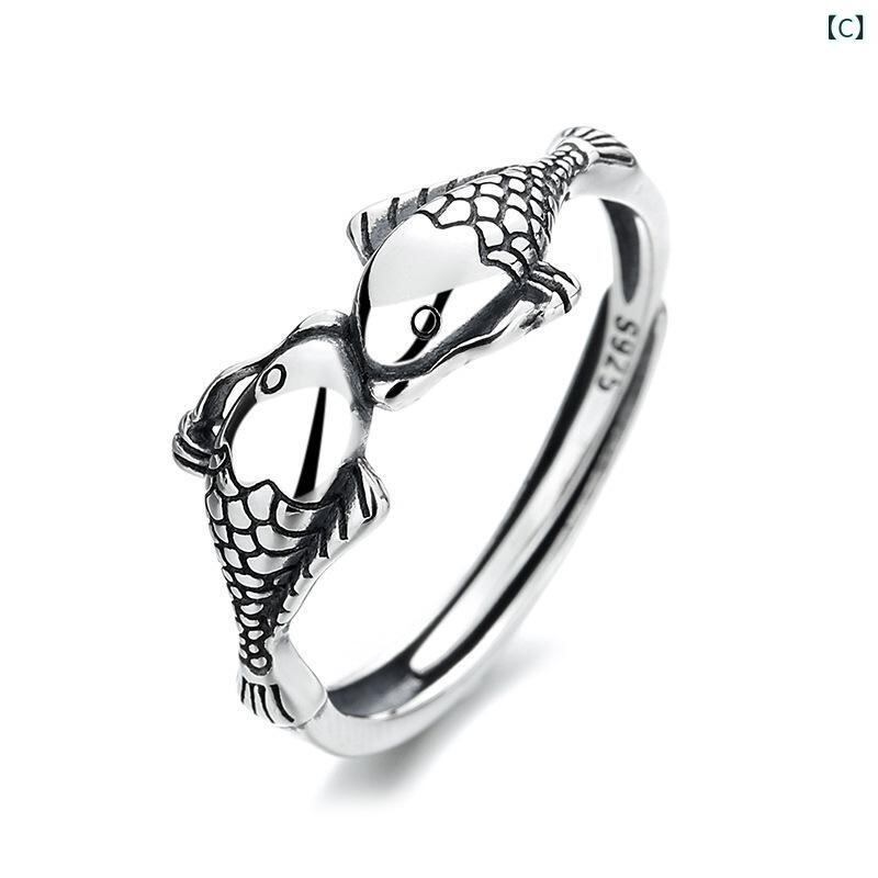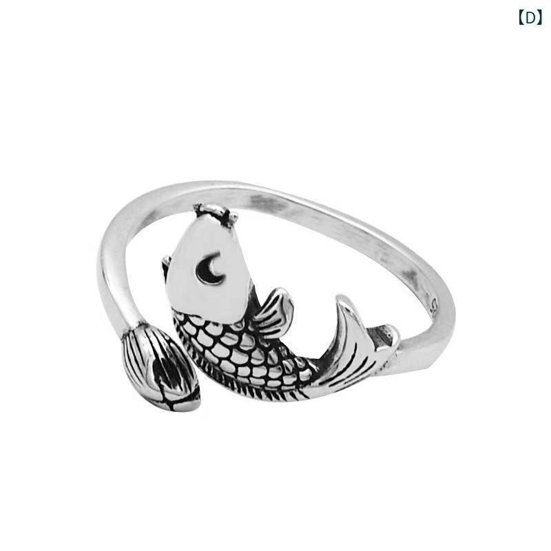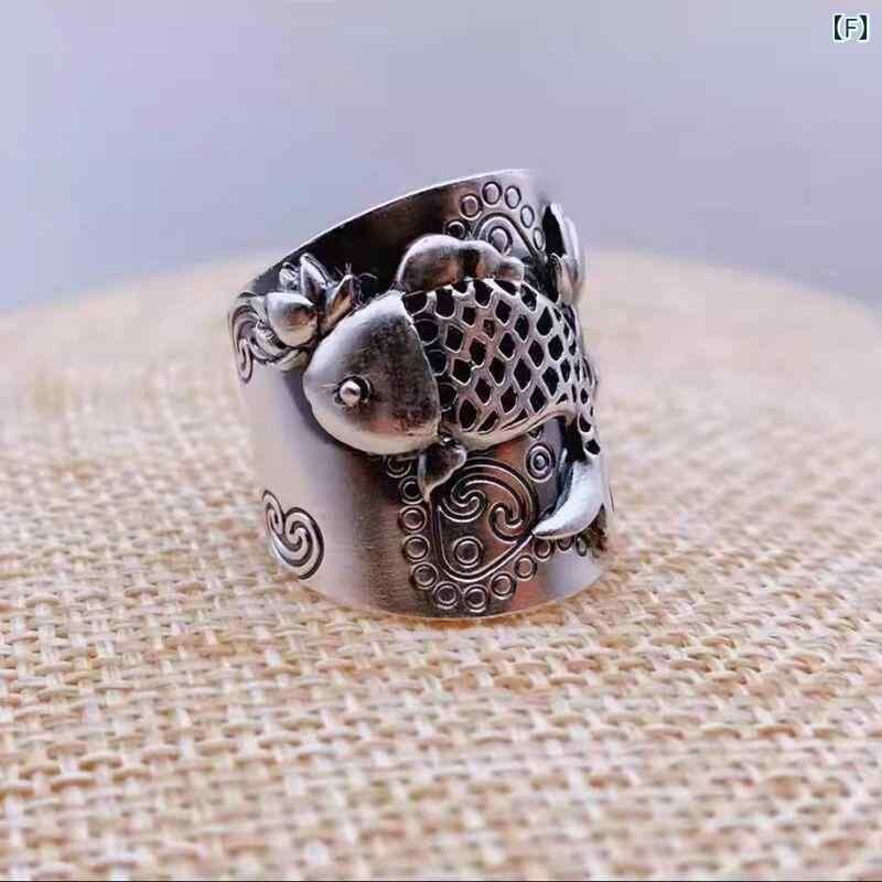 指輪 男女兼用 錦鯉 蓮 古銭 般若心経デザイン 開運 金運 レトロ アンティーク シルバーカラー オープンリング サイズ調節可能