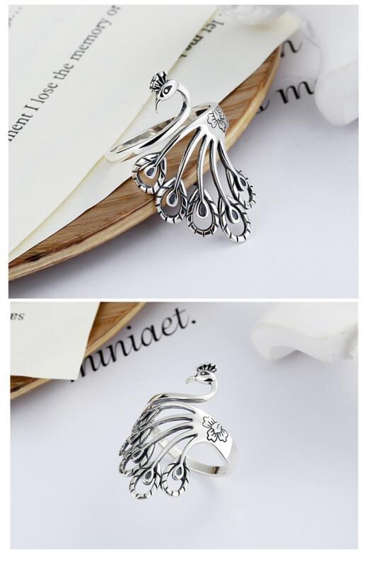 指輪 レディース 女性用 レトロ ヴィンテージ サイズ調節可能 フリーサイズ 孔雀 ピーコック 鳳凰 アニマルデザイン 動物モチーフ タイシルバー 幅広 民族調 エスニック アンティーク加工