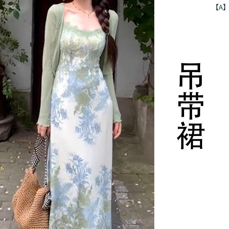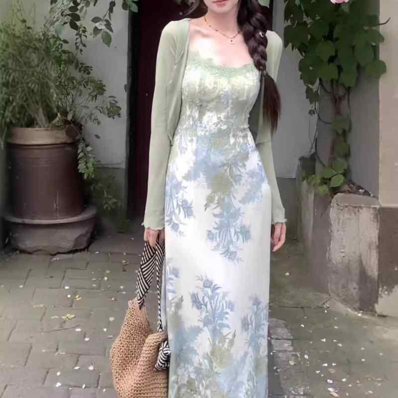 ワンピース レディース 夏 カーディガン 2点セット ロング キャミソールワンピース 花柄 レース切替 フレンチ エレガント 上品 リゾート 高ウエスト Aライン Uネック ノースリーブ ポリエステル 大人かわいい きれいめ お出かけ デート