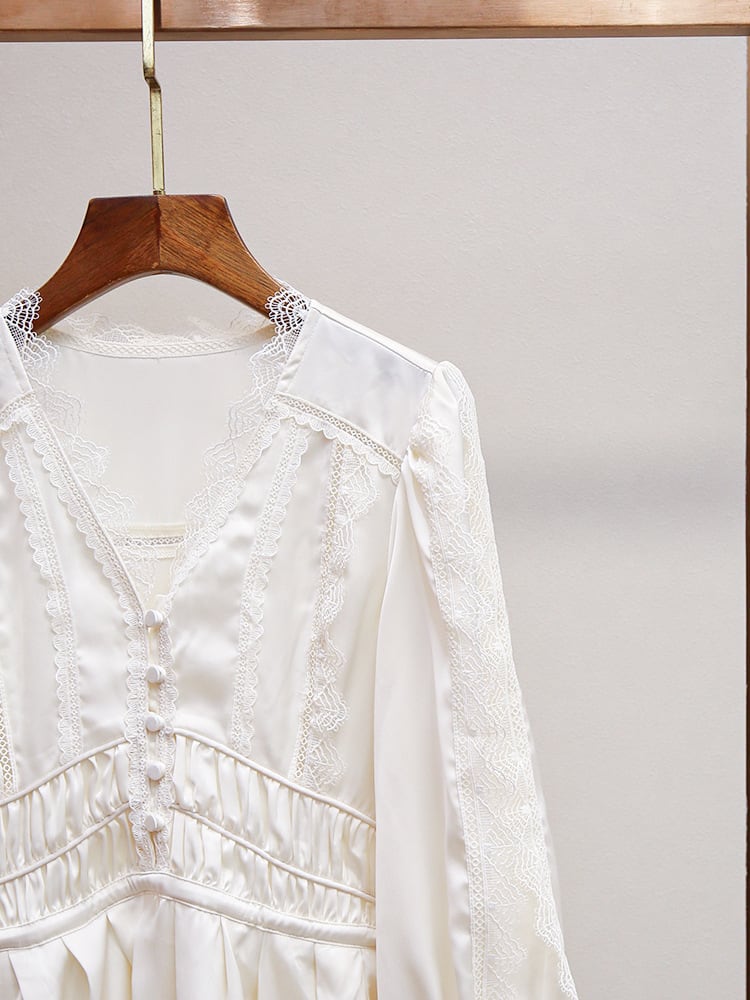 ワンピース レディース Vネック 長袖 レース ドローストリング ウエストシェイプ ハイウエスト Aライン フレア ミディ丈 上品 エレガント きれいめ 通勤 オフィス お呼ばれ フォーマル リラックス ゆったり 体型カバー アイボリー オフホワイト
