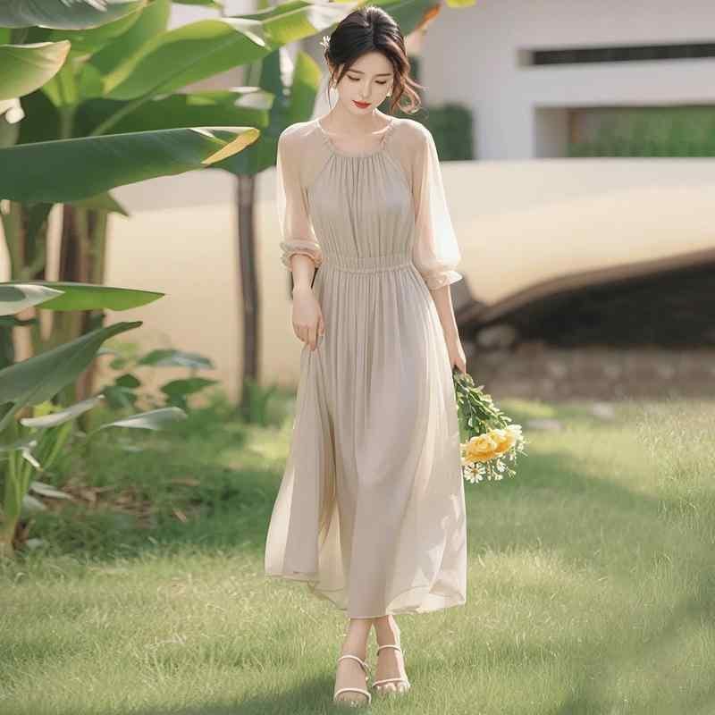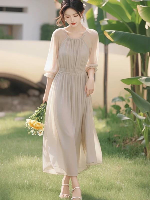 ワンピース レディース ポリエステル シフォン Aライン ウエストマーク プリーツ ミディ丈 長袖 クルーネック ウエストゴム エレガント フェミニン 上品 シンプル 個性派 通勤 オフィスカジュアル 着痩せ 細見え グレージュ