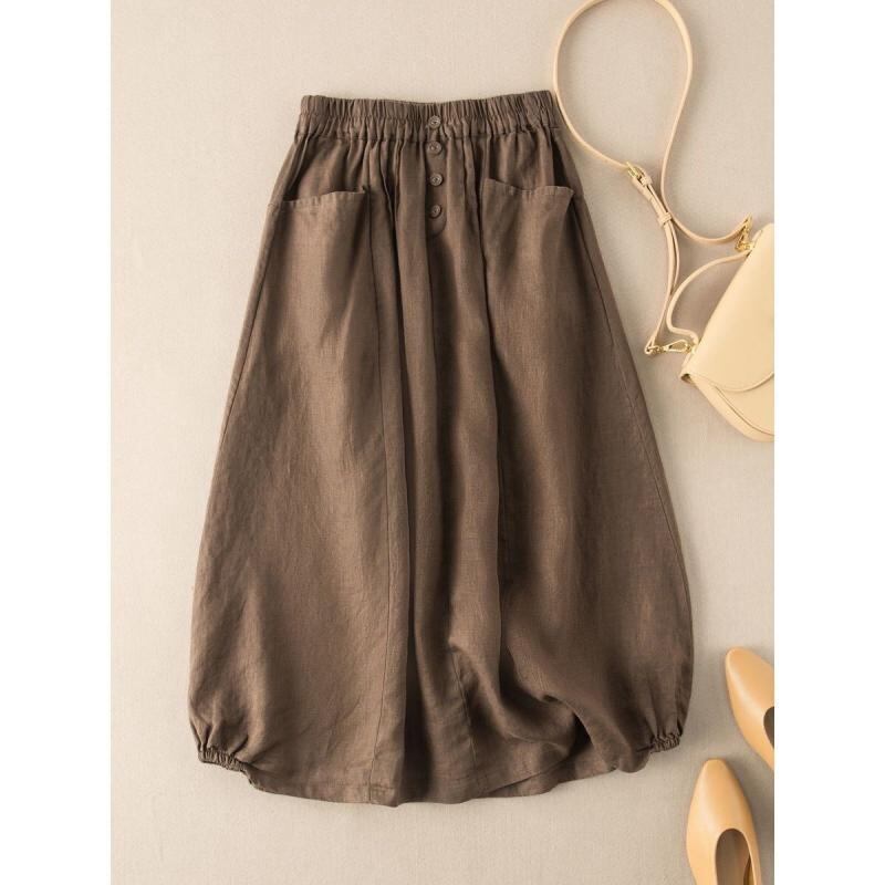 ロングスカート レディース 大きいサイズ 無地 麻調素材 レトロ Aライン ハイウエスト ミディ丈 細見え 体型カバー ナチュラル 上品 ブラック ミリタリーグリーン カーキ ダークネイビー