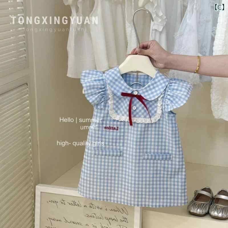 ワンピース 女の子 キッズ フレンチテイスト ブルー 青色 チェック柄 格子柄 ノースリーブ ベストワンピース スウィート プリンセスドレス コットン 綿 夏 普段使い カジュアル