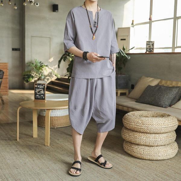 Tシャツ セットアップ メンズ 男性 チャイナ風 中国風 中華風 半袖 改良型 古風 漢服 唐装 上下セット 民族衣装 エスニック アジアンテイスト リラックスウェア 夏用 通気性 涼しい 軽量 普段着 カジュアル 優雅