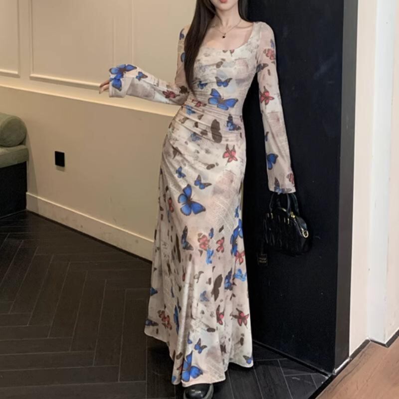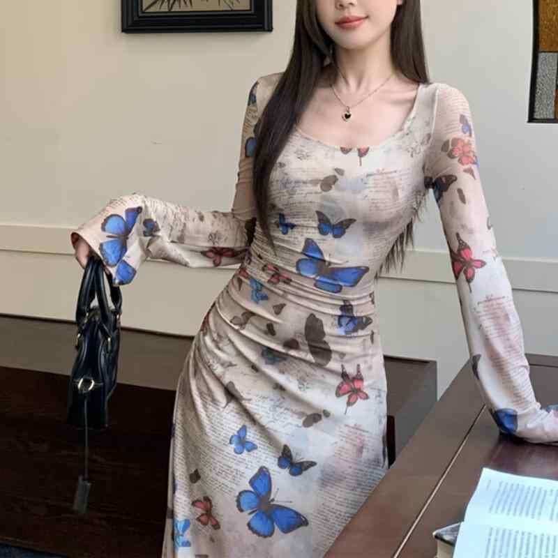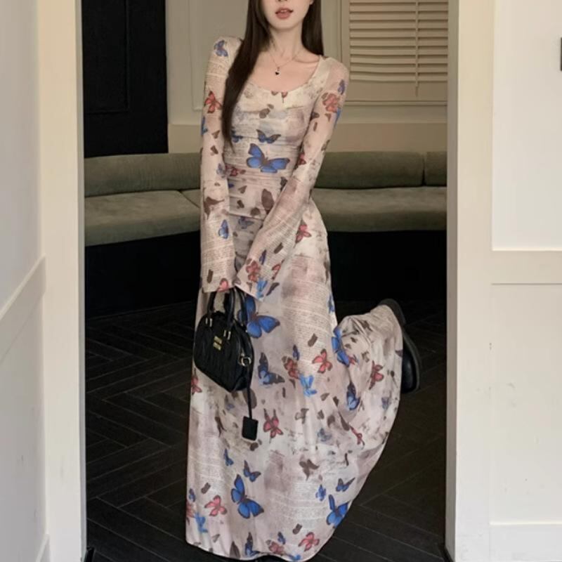ワンピース レディース 大きいサイズ ゆったり 体型カバー 着痩せ効果 レトロ セクシー 大人かわいい 蝶柄 プリント Uネック 長袖 ロング丈 タイトシルエット ポリエステル 秋 フォーマル オフィス カジュアル