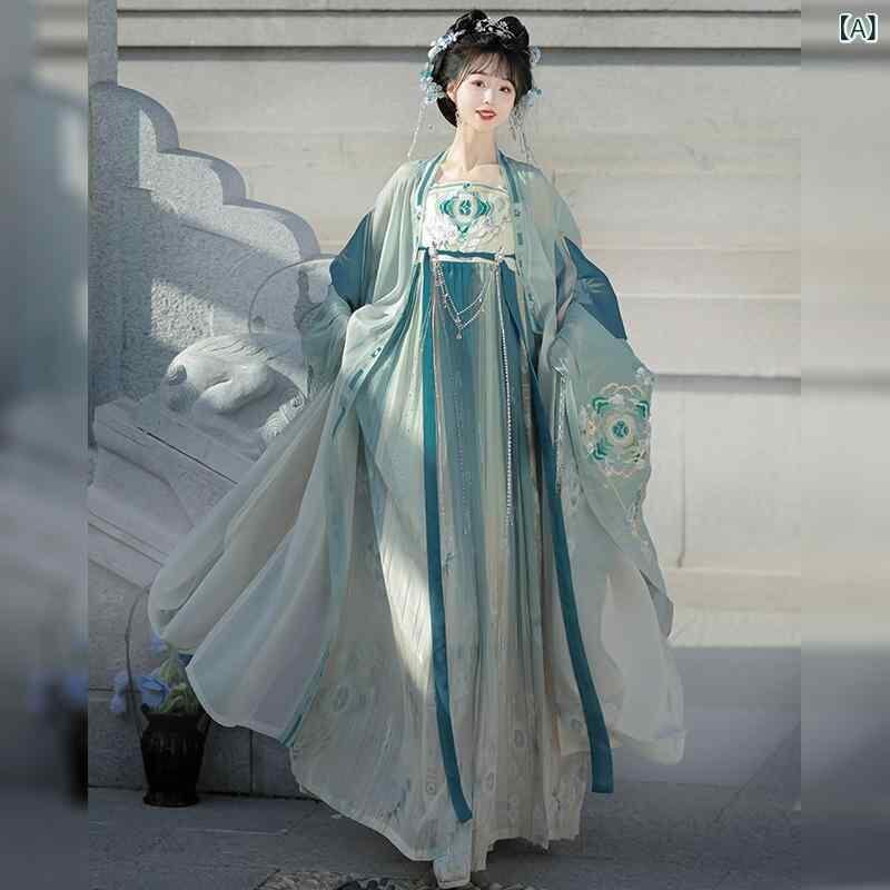 漢服 レディース 女性用 改良漢服 唐風 優雅 上品 華やか 刺繡 大袖衫 诃子裙 エスニック 普段使い 日常着 お洒落着 ポリエステル スパンデックス混紡 上質素材 魅力的 リボン紐