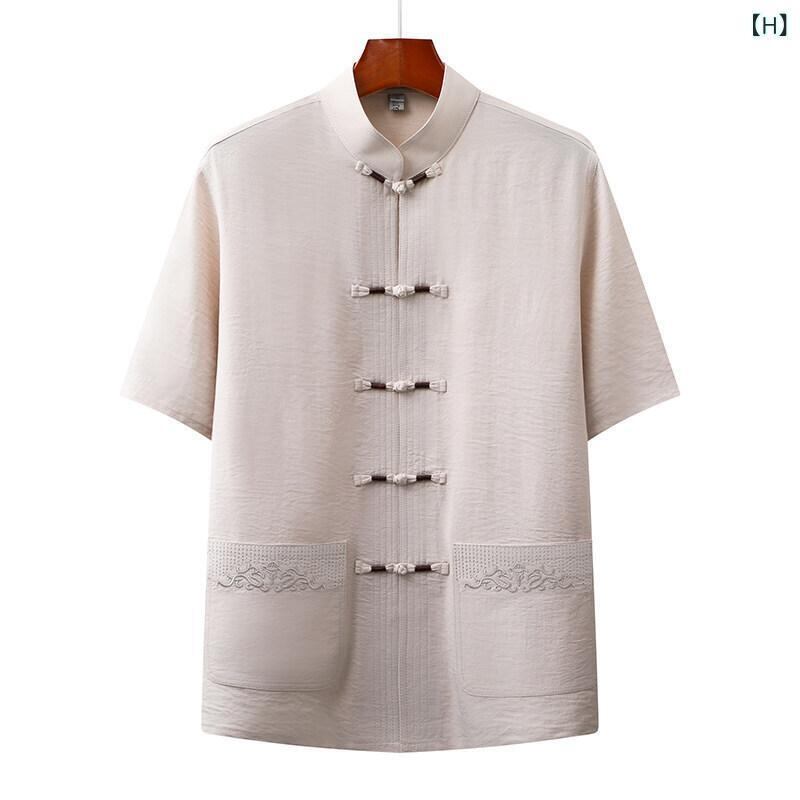 シャツ メンズ 中高年 男性 紳士 夏物 半袖 唐装 中国風 刺繍 ジャガード織り カジュアル トップス 上下セット ポリエステル素材 普段使い リラックスウェア 深灰色 浅灰色
