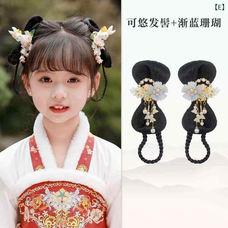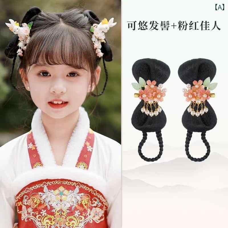 髪飾り 女の子 キッズ 漢服 ウィッグ一体型 お団子ヘアピース シニヨン 古風 レトロ リボン 蝶結び まとめ髪 アップスタイル コスプレ イベント用 フェザー