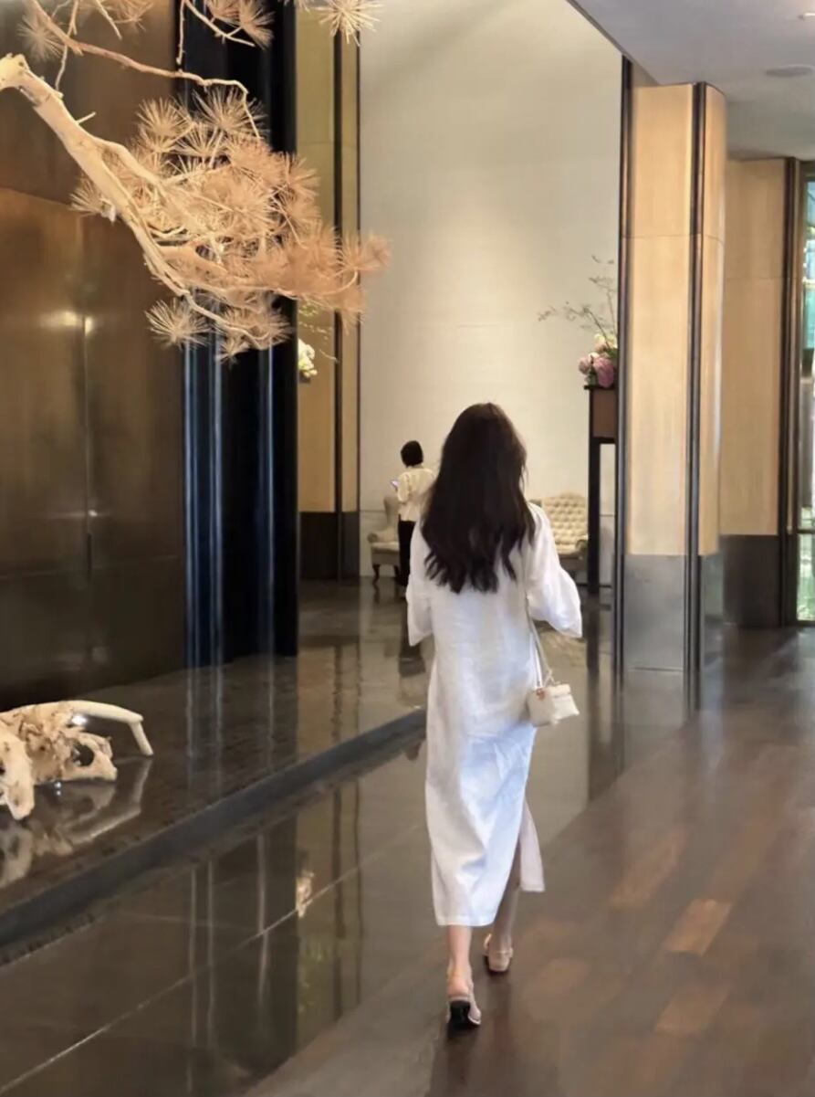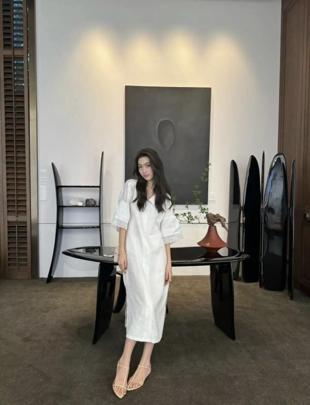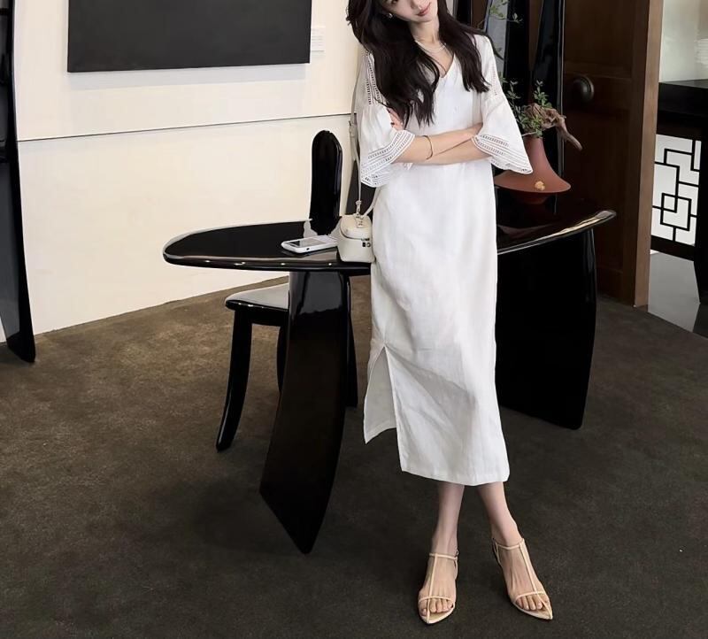 ワンピース レディース 夏 麻 リネン 透かし編み 切り替え レース 上品 エレガント Vネック ゆったり リラックス スリット ヴィンテージホワイト ロング丈 マキシ丈 七分袖 パフスリーブ ハイウエスト