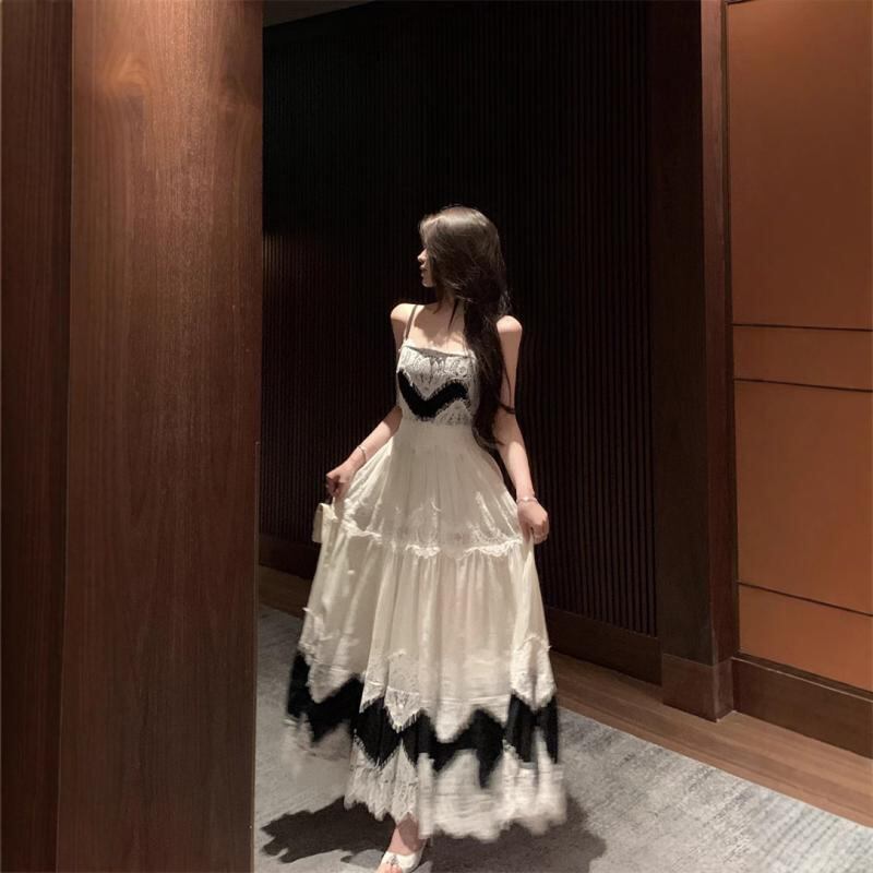 ワンピース レディース フレンチスタイル 高級感 レース パッチワーク ロング丈 キャミソール フレア ウエストマーク 細見え ブラック ホワイト バイカラー Aライン ハイウエスト フォーマル パーティー ドレス 上品 ポリエステル