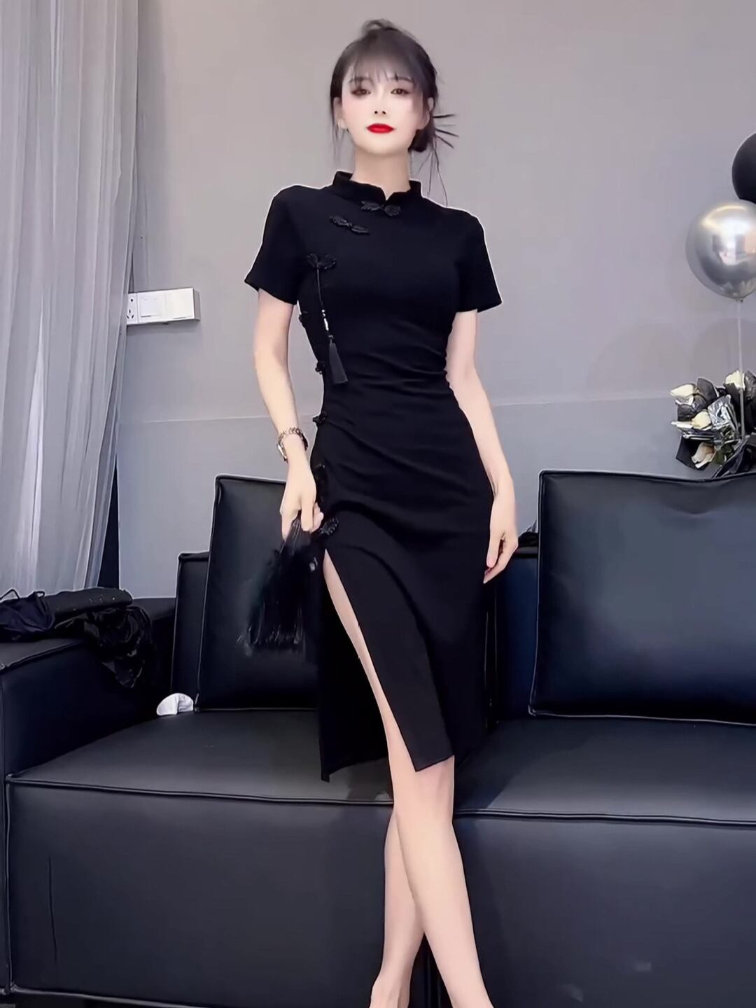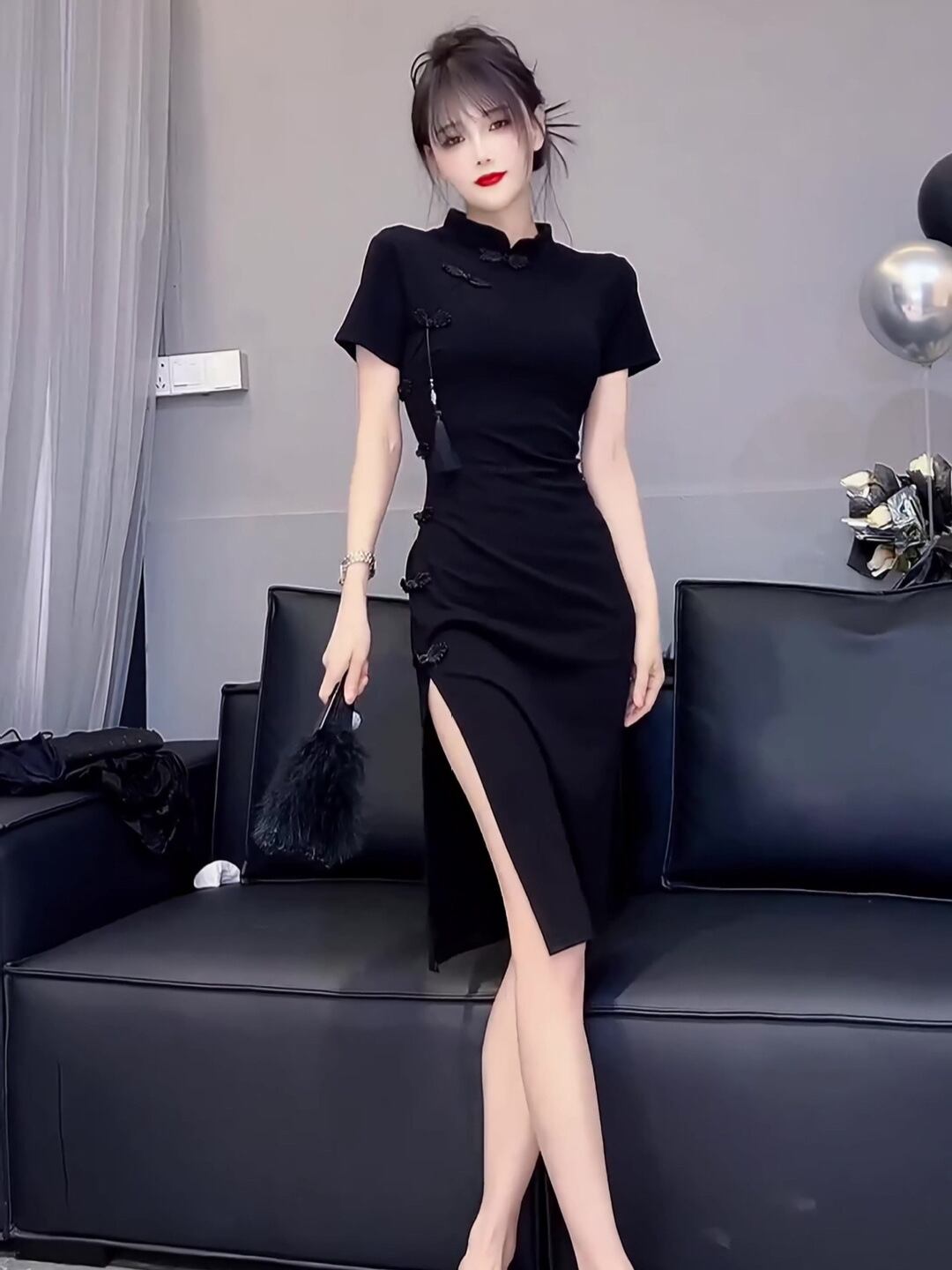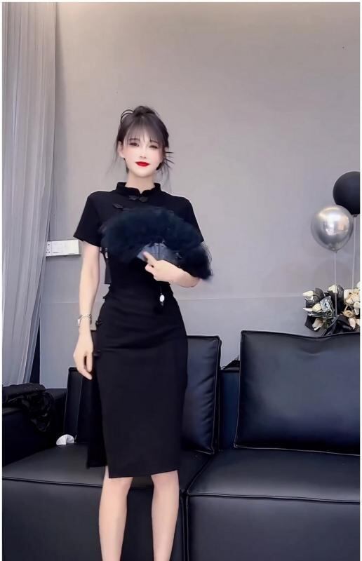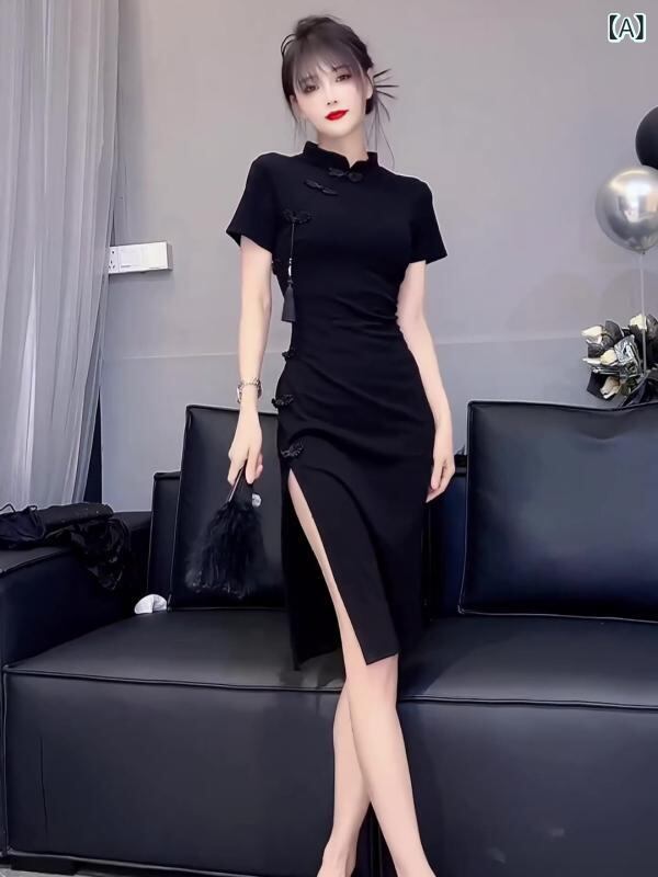 ワンピース レディース 新中華風 レトロ エレガント 上品 改良 チャイナドレス風 デザイン Aライン ミニ丈 スタンドカラー 半袖 ハイウエスト ポリエステル ブラック フェミニン スイート