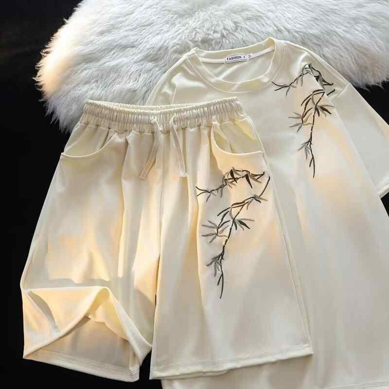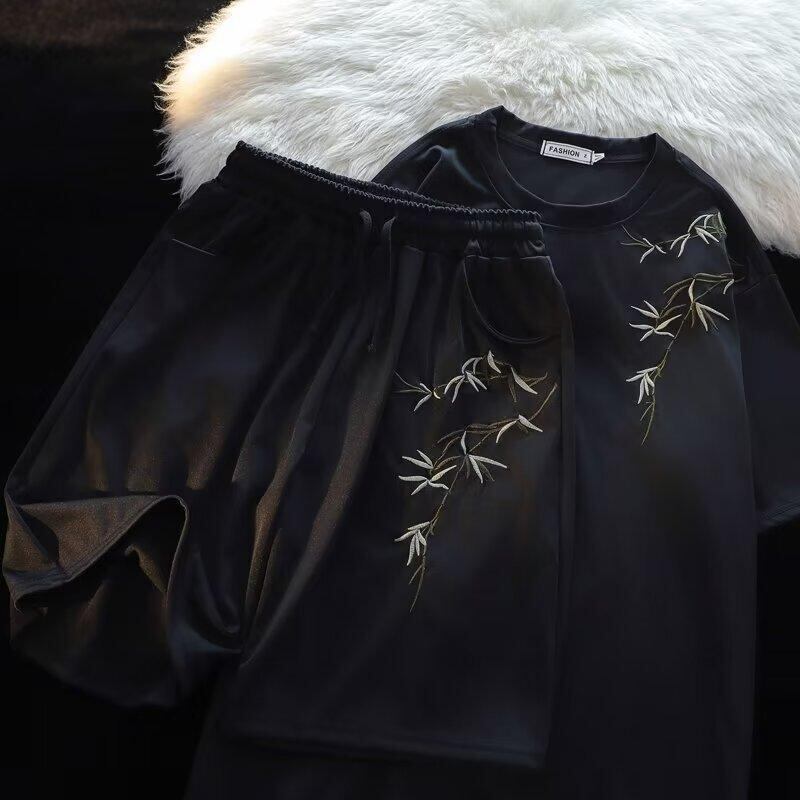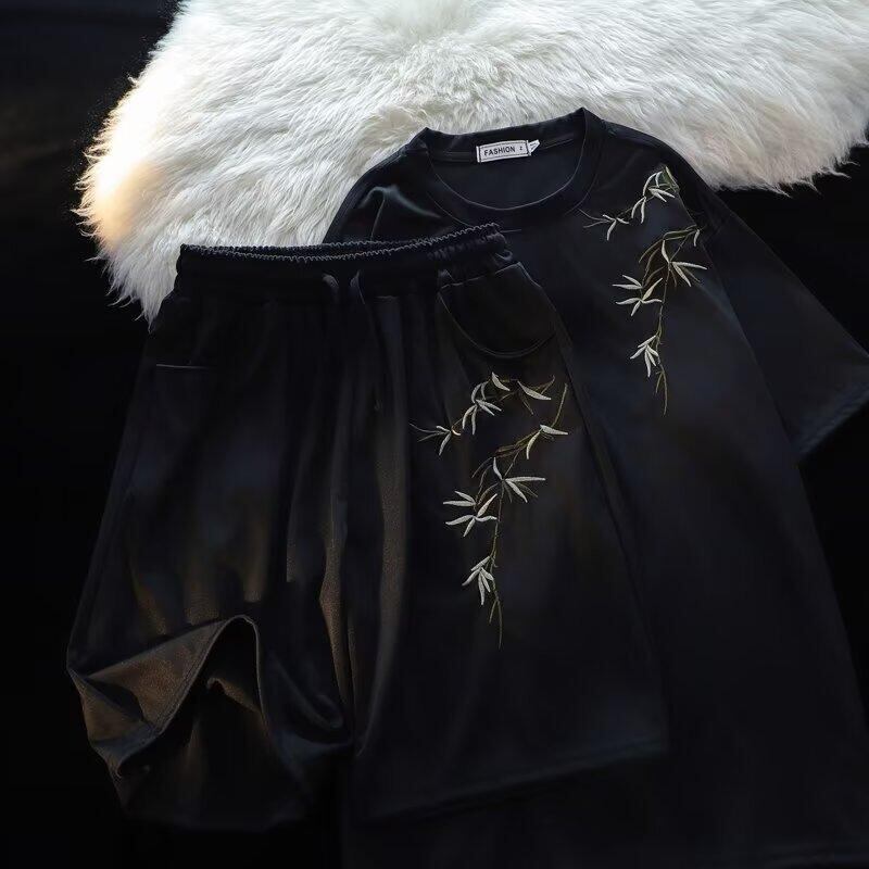 セットアップ メンズ 半袖 Tシャツ ショートパンツ 刺繍 竹柄 新中華風 エスニック クール スタイリッシュ トレンド ストリート カジュアル リラックスウェア 上下セット 綿混 ポリエステル 杏色 ブラック