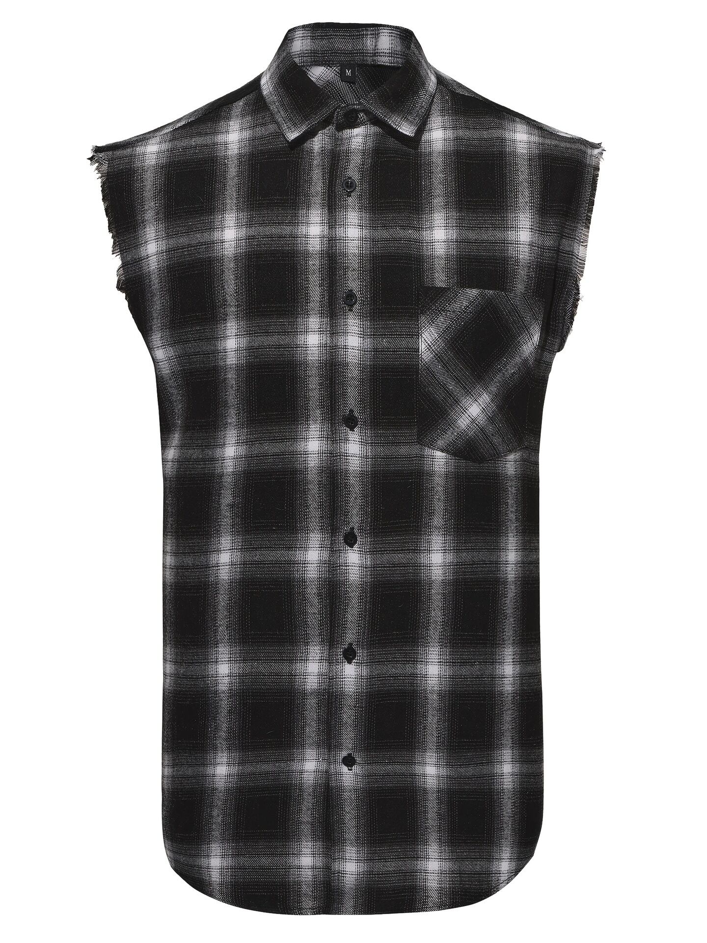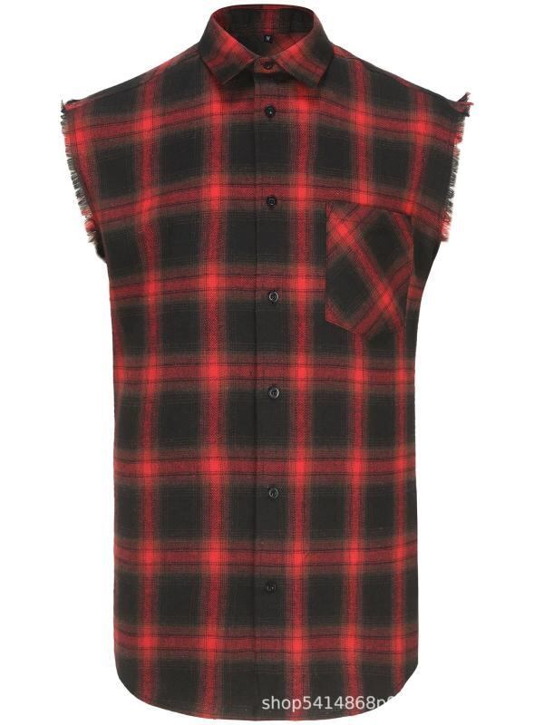 シャツ メンズ ノースリーブ チェック柄 フリンジ カットオフ 襟付き カジュアル アメカジ ポリエステル 通気性 スリムフィット レッド ブラック ワインレッド