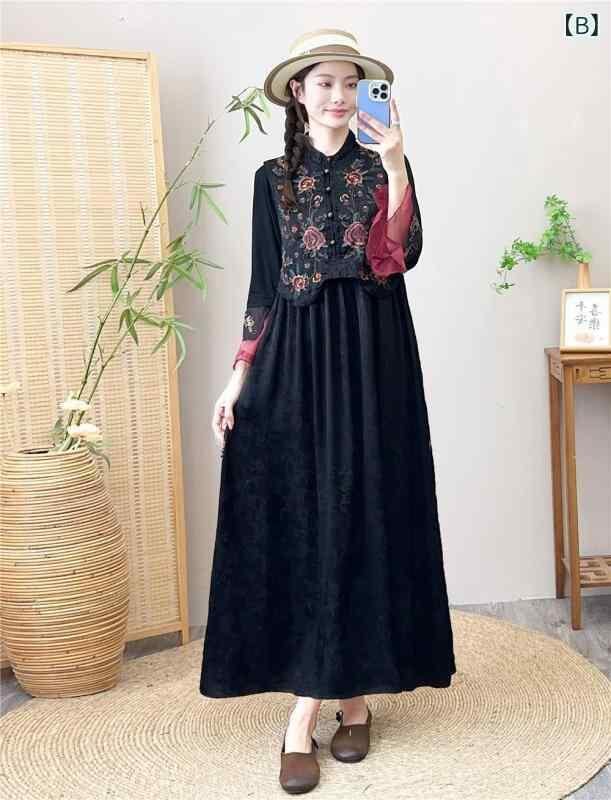 ワンピース レディース 文芸レトロ 民族風 サテン生地 長袖 ゆったり ロング丈 Aライン スタンドカラー ハイウエスト ポケット付き レーヨン 綿混