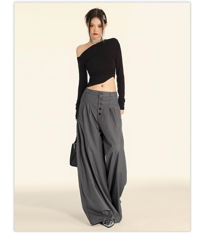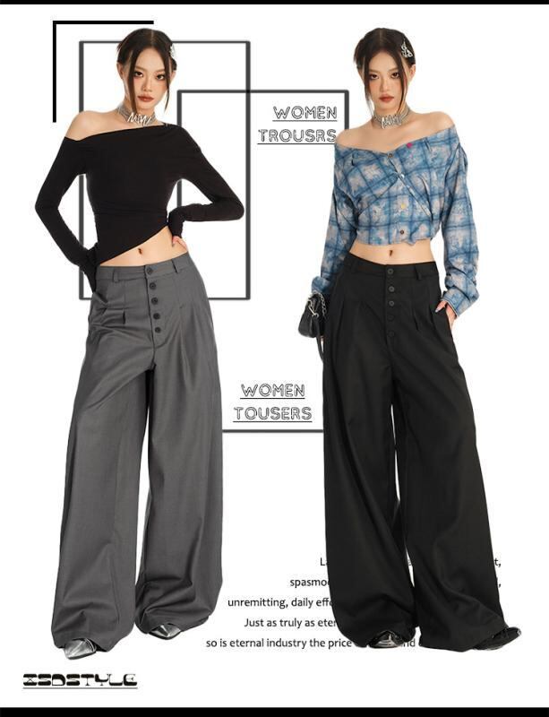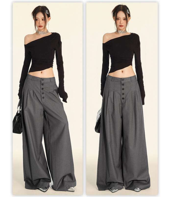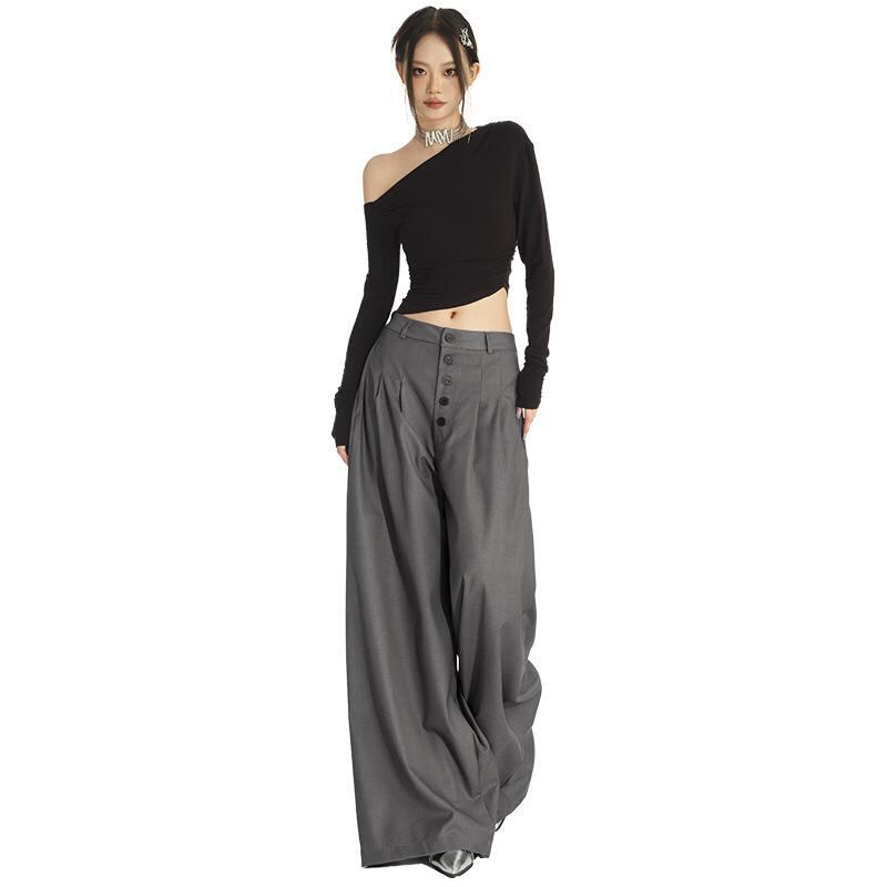 ワイドパンツ カジュアル ボタンフライ アメリカンレトロ 落ち感 フルレングス スラックス