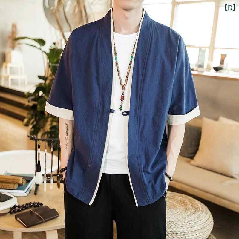 唐装 メンズ 男性用 薄手 ジャケット 五分袖 チャイナ風 和風 カーディガン 禅修服 スタンドカラー 綿 普段着 カジュアル おしゃれ グレー ブラック ワインレッド ネイビー