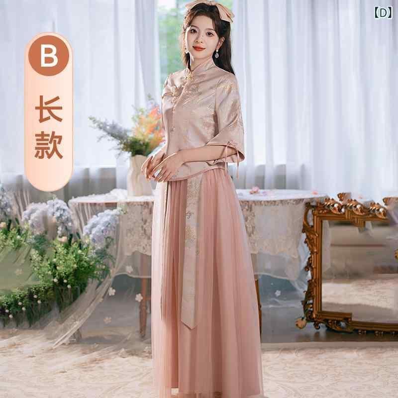 ドレス レディース 中華風 ブライズメイドドレス 伴娘ドレス ロング丈 長袖 スタンドカラー エレガント 上品 フォーマルドレス パーティードレス ポリエステル メッシュ 結婚式 二次会 お呼ばれ 普段使い グレー ピンク