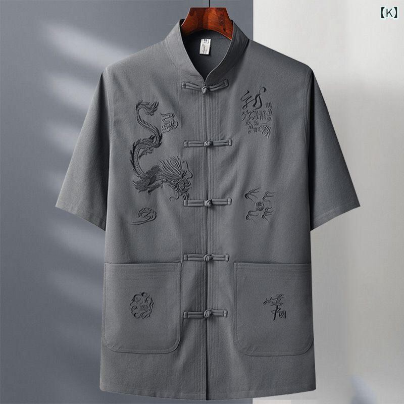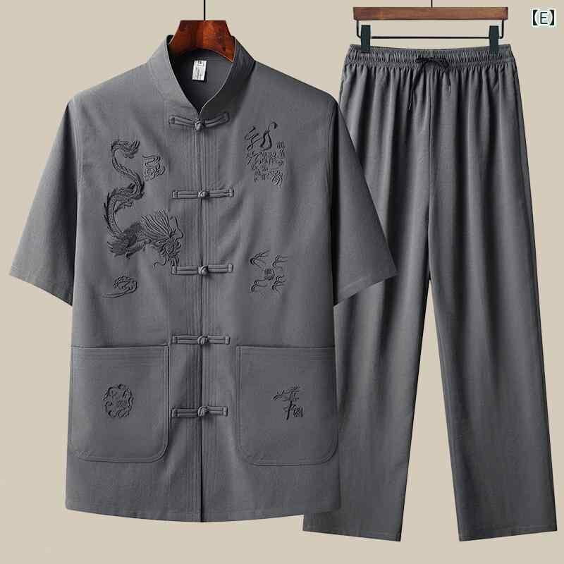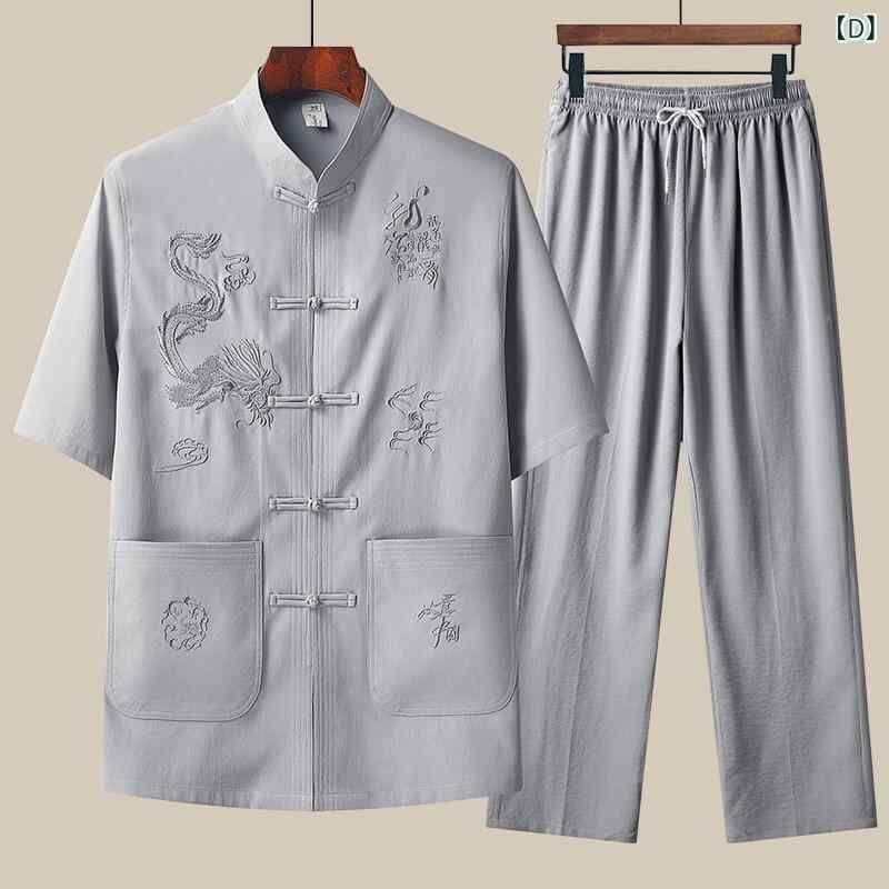 セットアップ メンズ シニア 父 祖父 唐装スタイル 中国風 夏 薄手 軽量 接触冷感 半袖 カジュアル リラックスウェア 普段着 上下セット