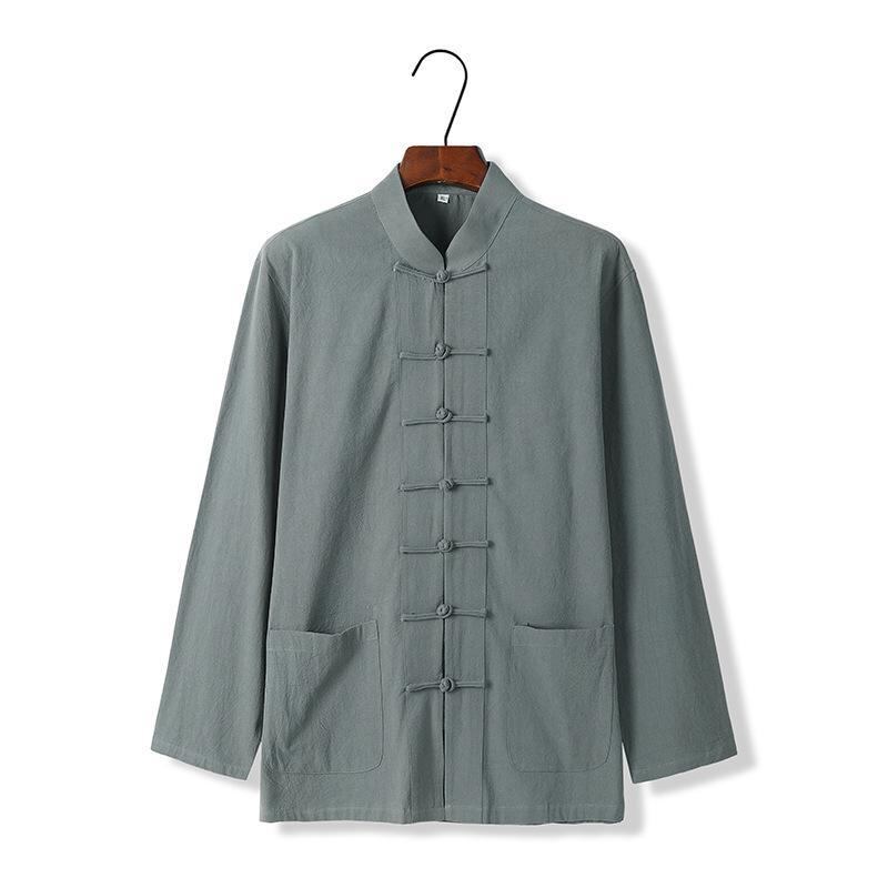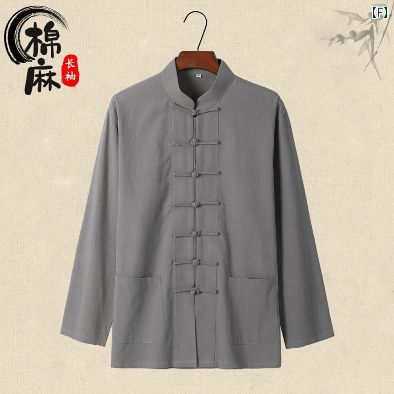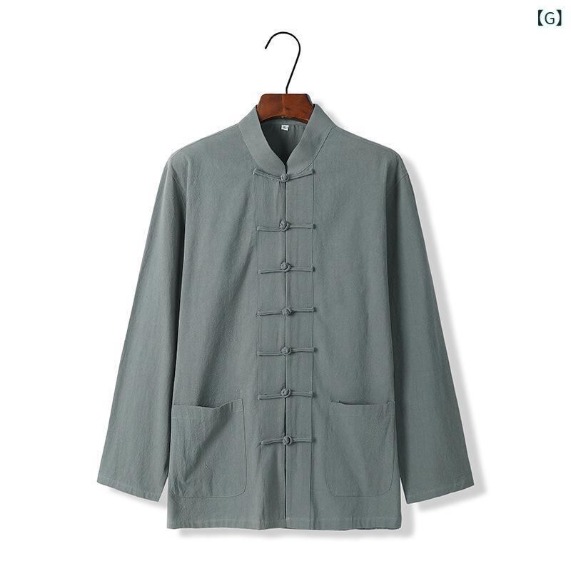 シャツ メンズ 長袖 綿麻 スタンドカラー 立ち襟 チャイナボタン 中国風 レトロ 無地 ゆったり リネン トップス 男性用 カジュアル 春秋 イージーケア