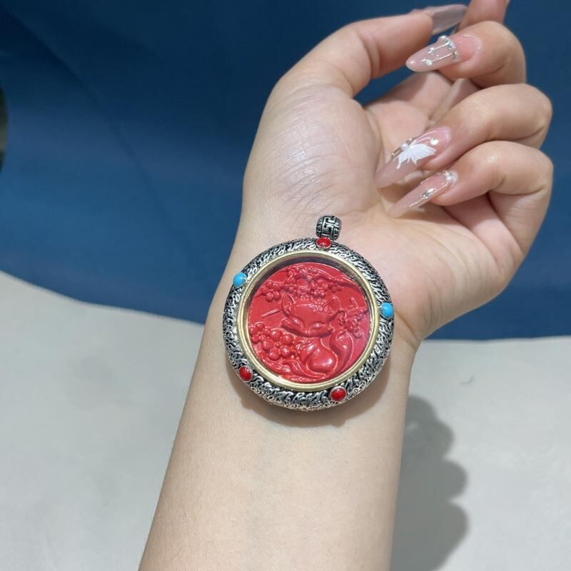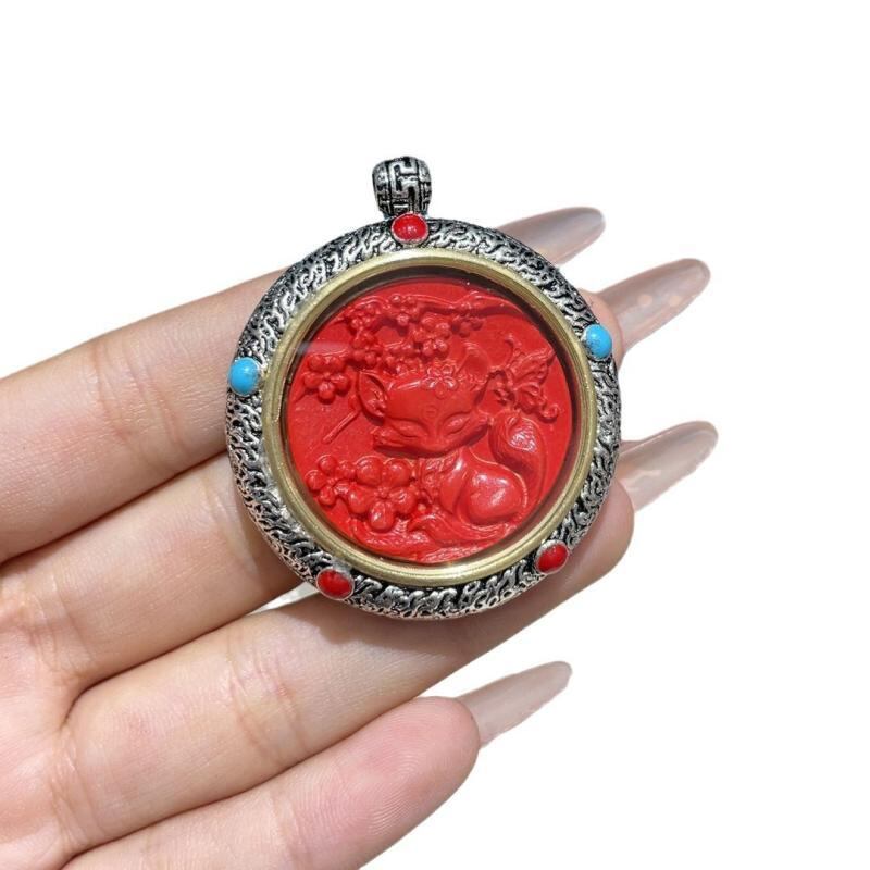 ネックレス メンズ レディース 九尾の狐 九宮八卦 辰砂 朱色 ペンダント お守り 魔除け 開運 縁起物 幸運 チャーム レトロ アンティーク風