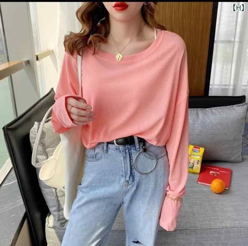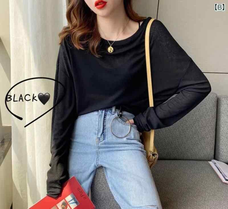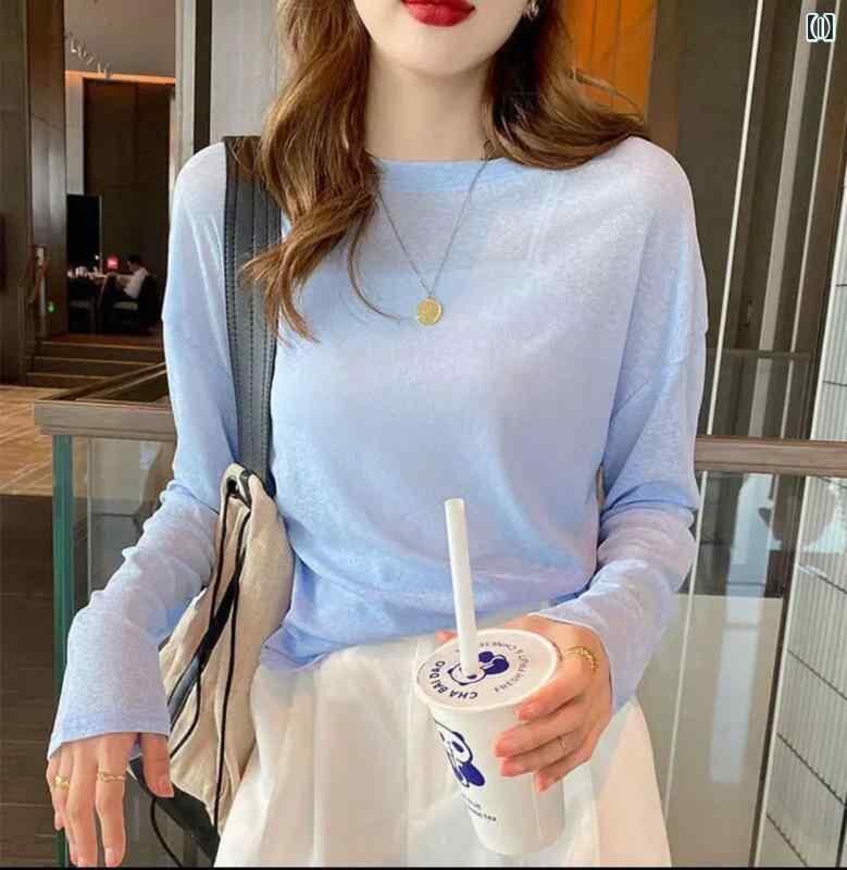 トップス レディース 長袖 Tシャツ ゆったり 薄手 着痩せ ラウンドネック UV対策 接触冷感 再生繊維 ミドル丈 ストレートシルエット マカロンカラー 普段使い カジュアル