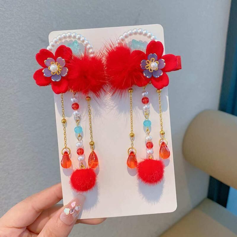 髪飾り キッズ 女の子 レッド 赤色 お正月 新年 お祝い 七五三 節句 漢服 中華風 古風 和風 レトロ 花飾り 蝶々 タッセル リボン 飄帯 合金製 パール 髪留め ヘアクリップ かわいい 華やか