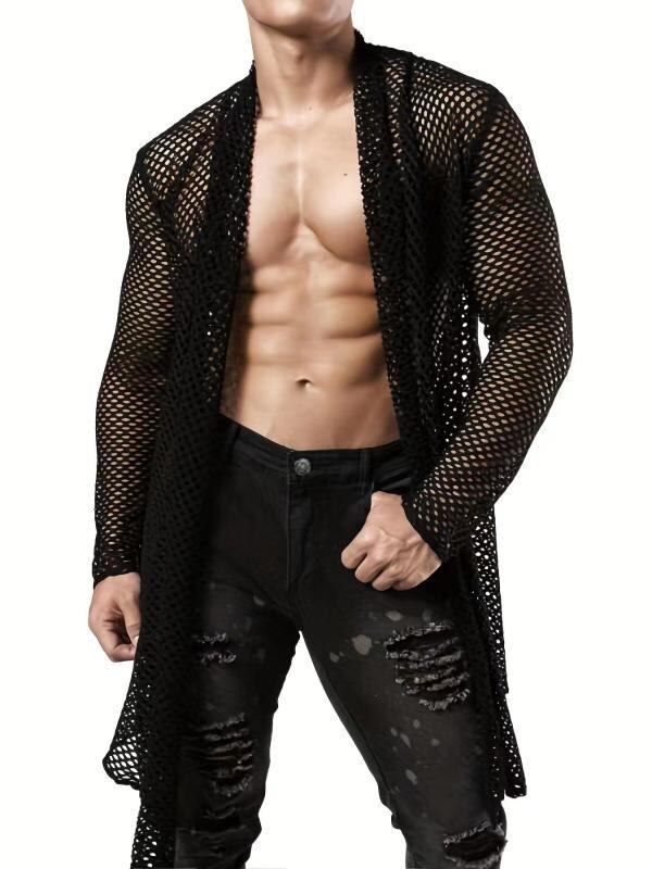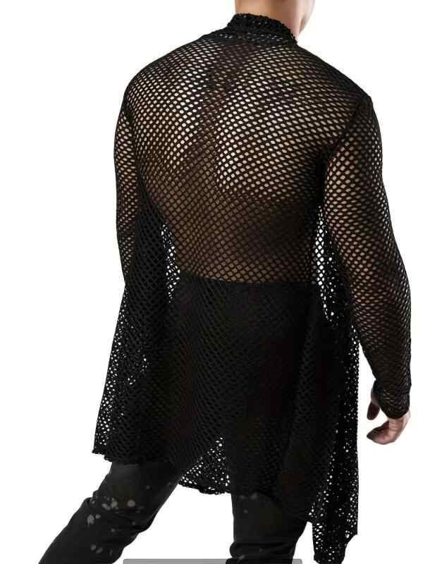 シャツ メンズ ロング丈 長袖 メッシュ シースルー 開襟シャツ 欧米風 ストリート 個性的 ルーズフィット カジュアル 羽織り ポリエステル 通気性 防シワ イージーケア ブラック
