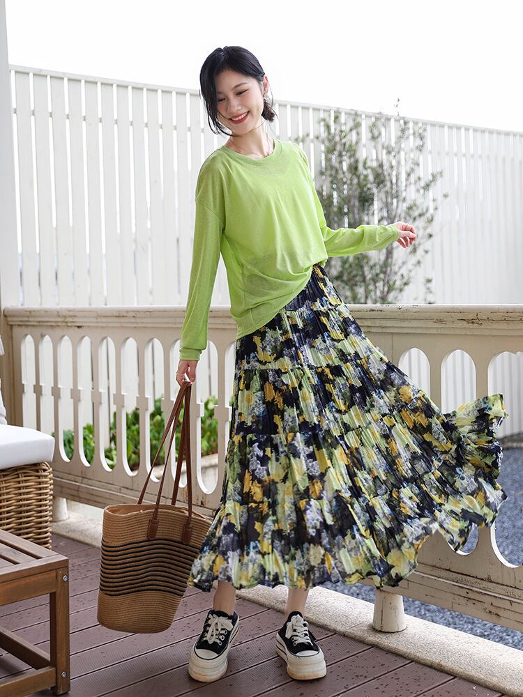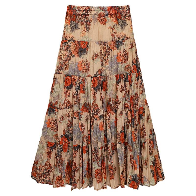 半身スカート レディース フレンチロマンティック 油絵風プリント 5段ティアード 小花柄 ボヘミアン リゾート 通勤 カジュアル 普段使い Aライン フレア ミモレ丈 ポリエステル 伸縮性 ブラック パープル オレンジ