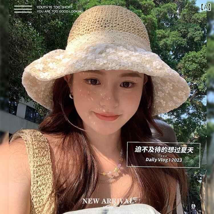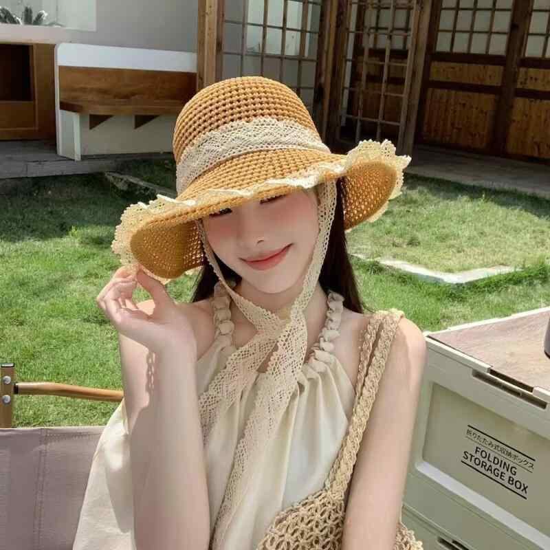 麦わら帽子 レディース UVカット 日よけ帽 つば広 レース縁 透かし編み フレンチスタイル ストローハット 夏 リゾート ビーチ 海水浴 旅行 日焼け対策 通気性 フェミニン かわいい ナチュラル 小顔効果