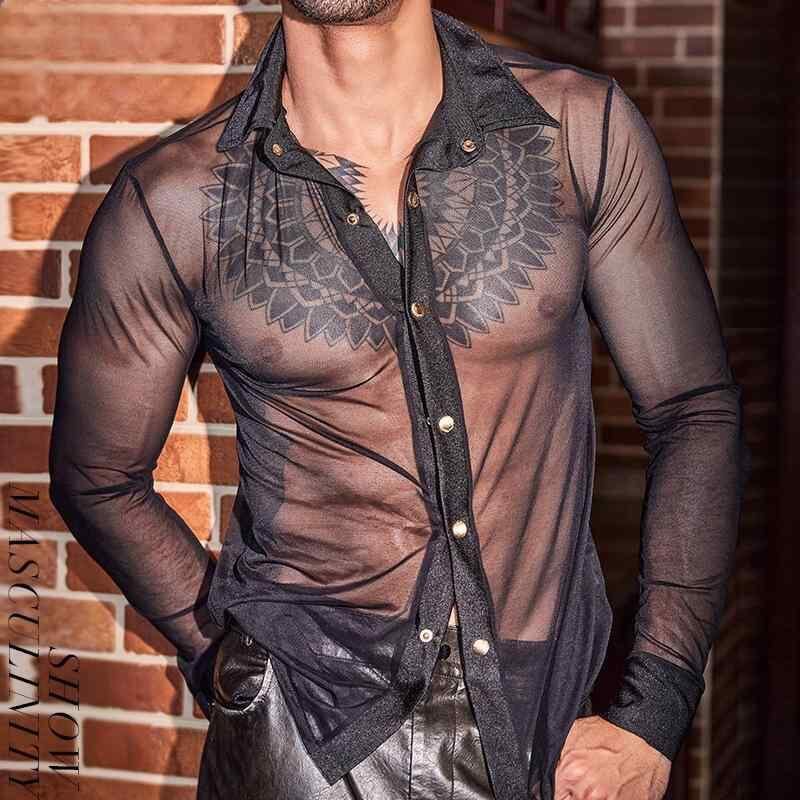 シャツ メンズ 黒 薄手 シースルー 透け感 シフォン レース ポリエステル スリムフィット タイトフィット 通気性 涼しい 長袖 襟付き カジュアル 夏物 ナイトクラブ 演出服 大人カジュアル きれいめ