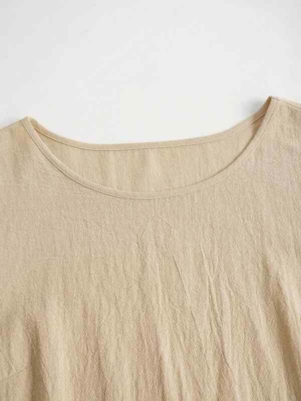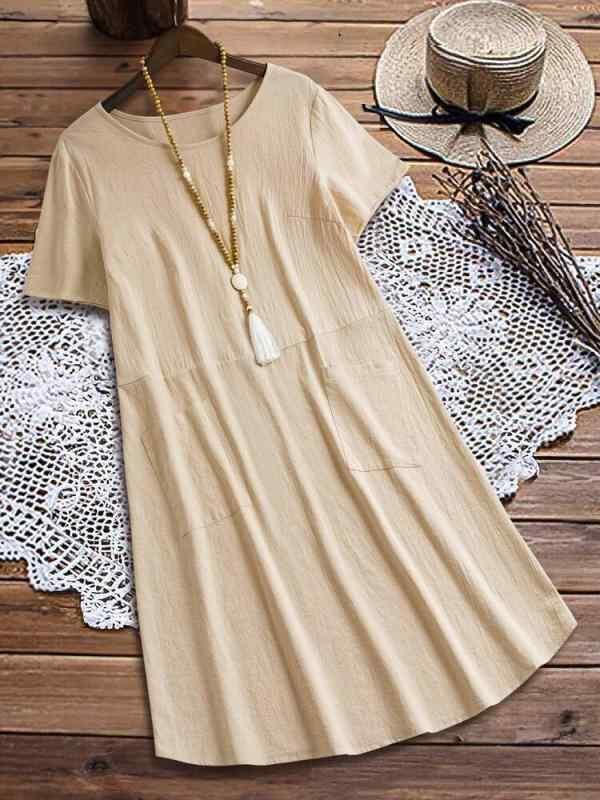 ワンピース レディース レトロ ヴィンテージ ゆったり リラックスフィット Aライン ポケット付き 無地 半袖 ミディ丈 コットンリネン 綿麻 カジュアル アイボリー