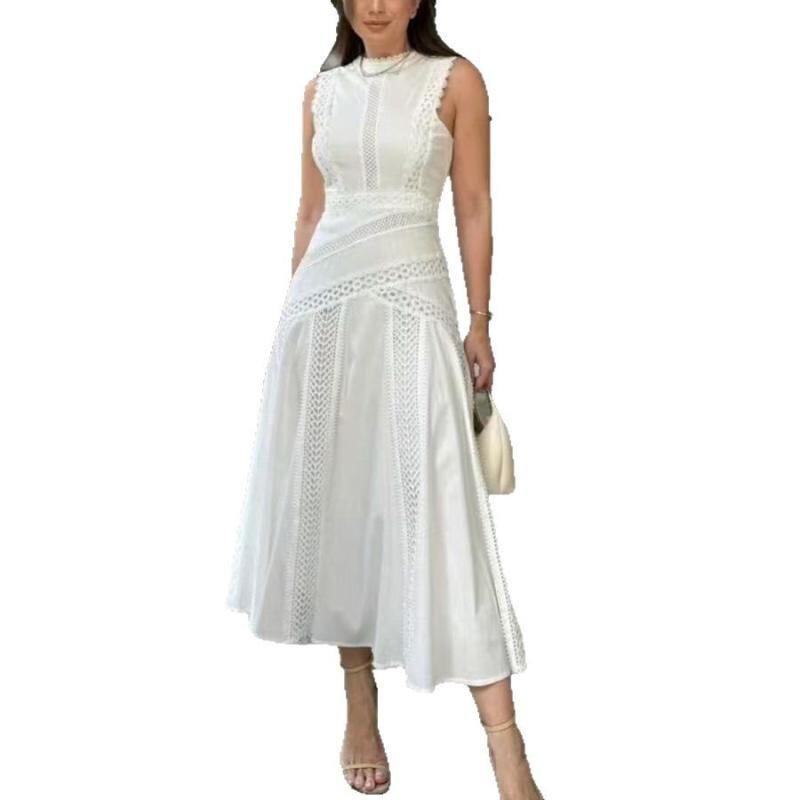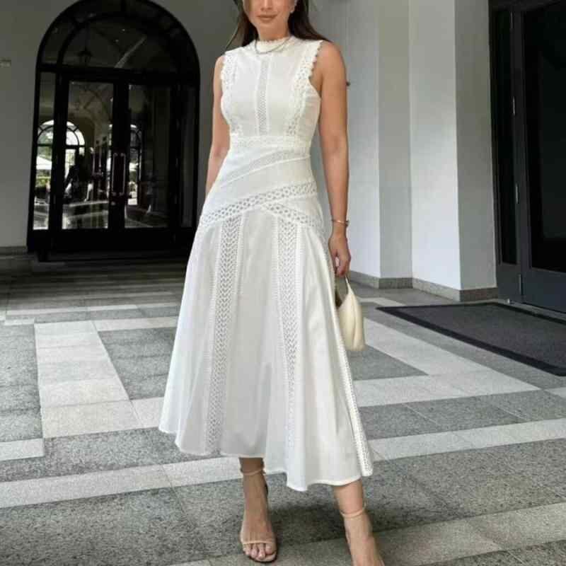 ワンピース レディース 立ち襟 ノースリーブ レース切り替え カットアウト ウエストマーク ロング丈 ポリエステル 無地 ハイウエスト ベーシック 通勤 オフィス 普段使い エレガント フェミニン プルオーバー ブラック ホワイト ライトブルー