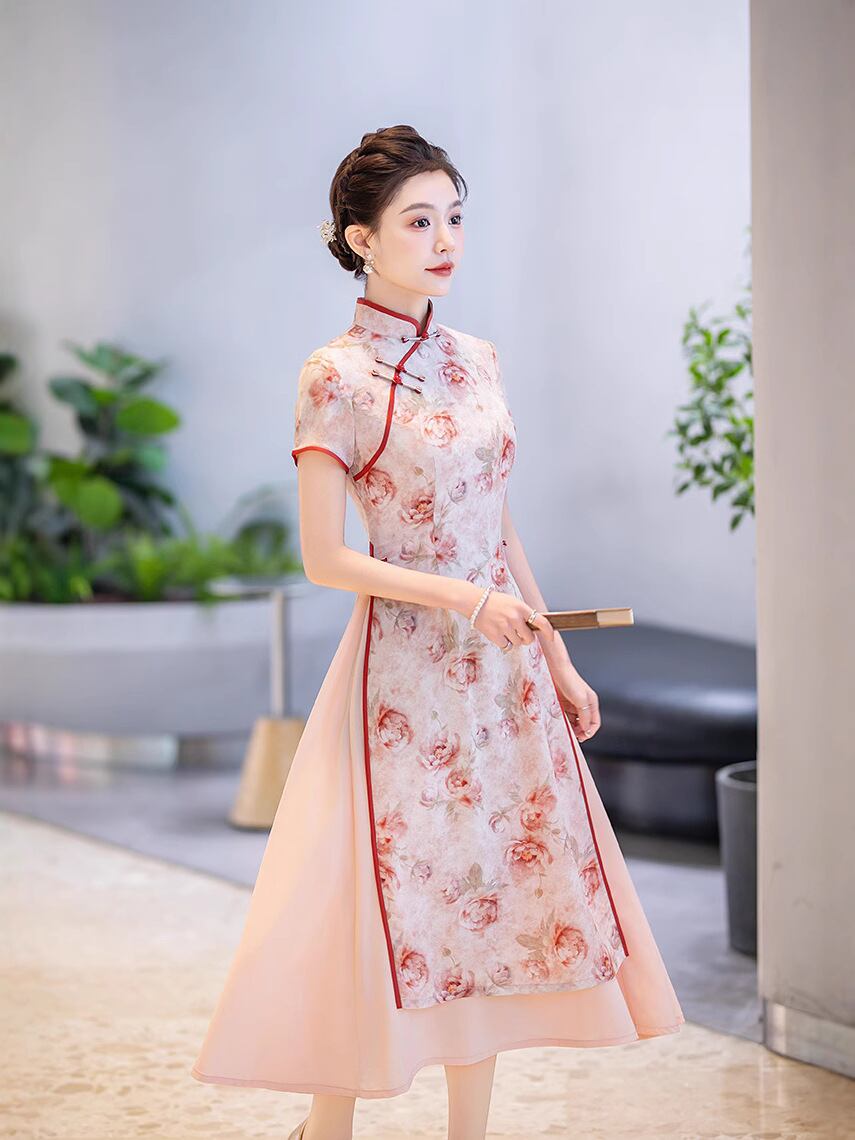 チャイナドレス レディース 改良型 新中国風 レトロ クラシック ロングワンピース 夏 普段使い スタンドカラー 斜め襟 半袖 花柄ジャカード織り パイピング ポリエステル ストレッチ素材 ブルー ピンク レッド