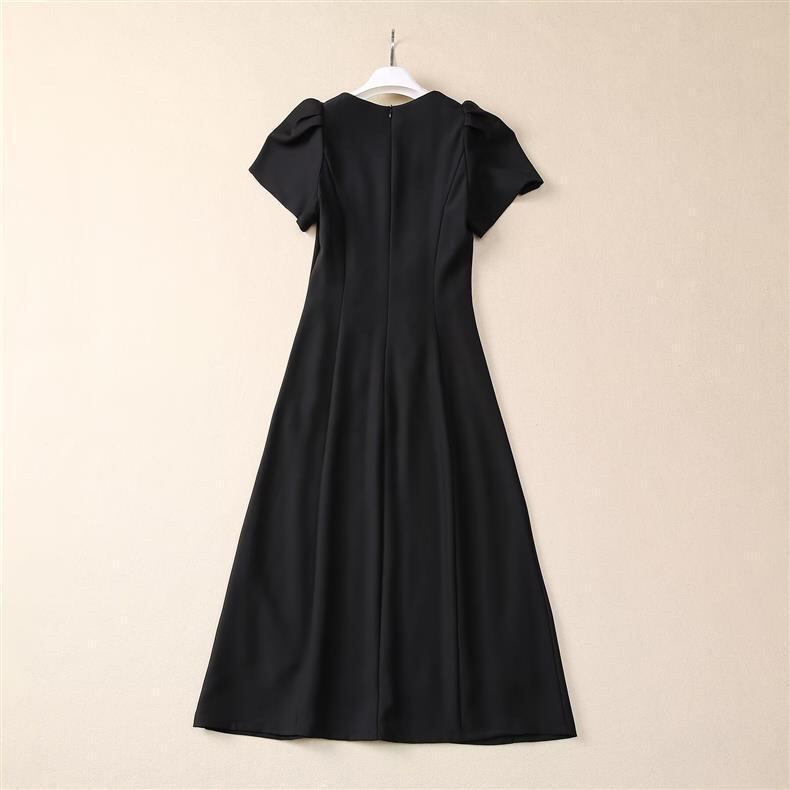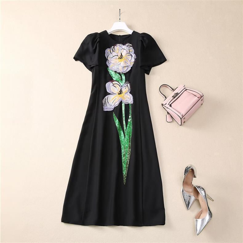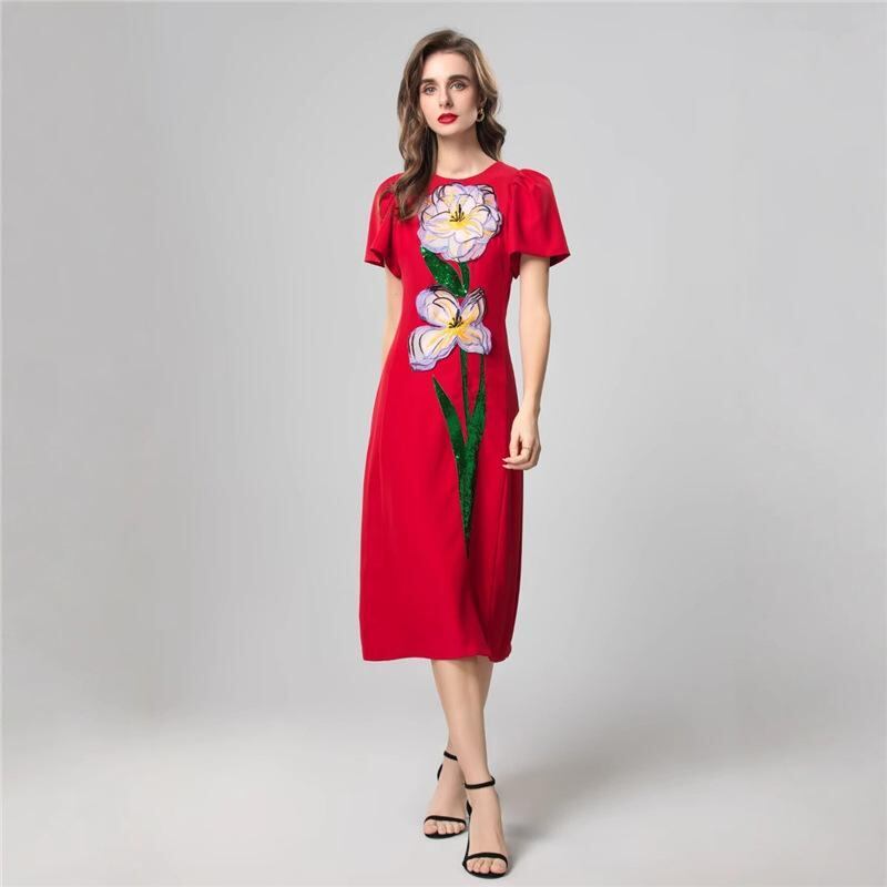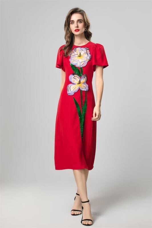ワンピース レディース 半袖 レトロ クラシック エレガント 上品 ミディ丈 花柄 刺繍 スパンコール ラウンドネック ポリエステル 黒 赤