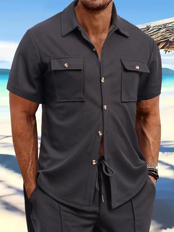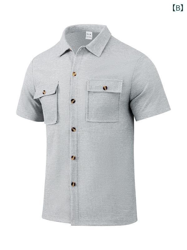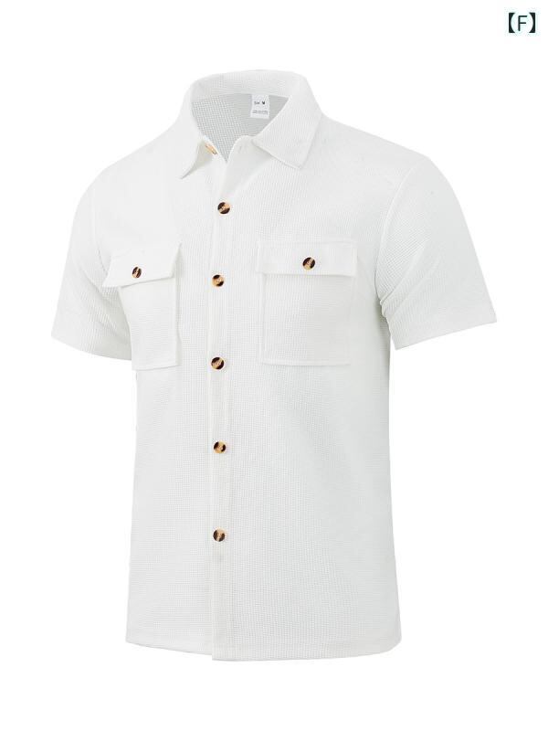 シャツ メンズ ワッフル 半袖 襟付き ボタン ポケット付き カジュアル 普段使い ゆったり ルーズフィット ポリエステル 洗濯可能 ストレッチ ノーアイロン加工 無地 夏物 着回し