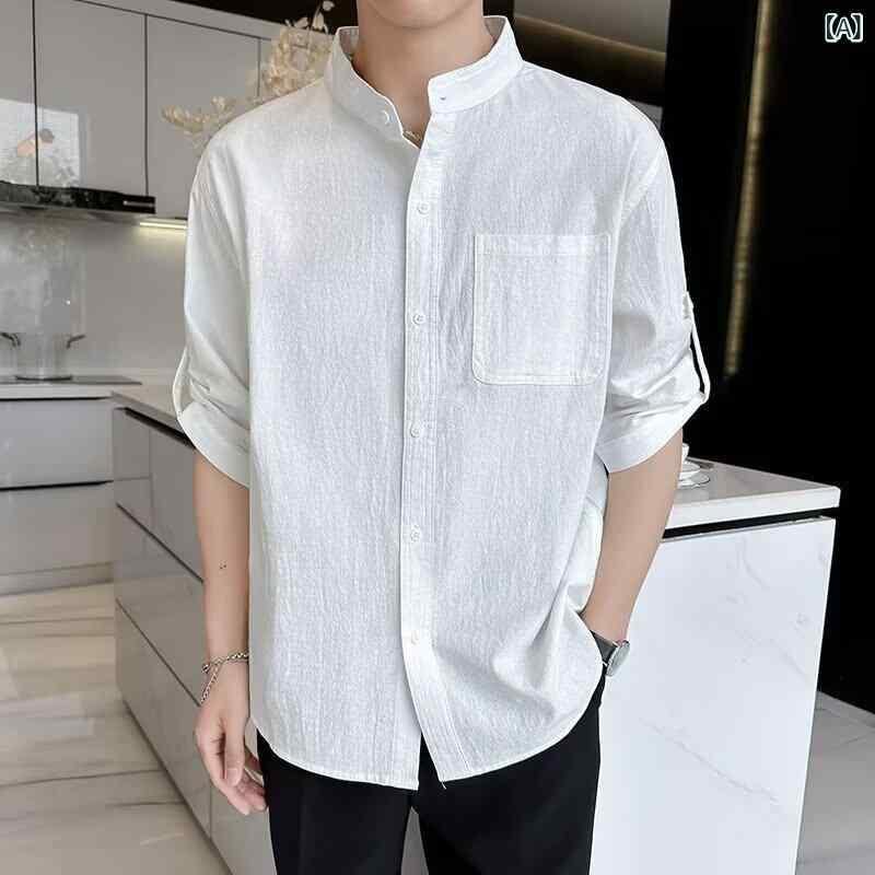 シャツ メンズ 綿麻素材 ゆったり ルーズフィット カジュアル 長袖 薄手 軽量 夏用 羽織り 中華風 エスニック調 ワイドカラー 大きいサイズ ホワイト ブラック カーキ