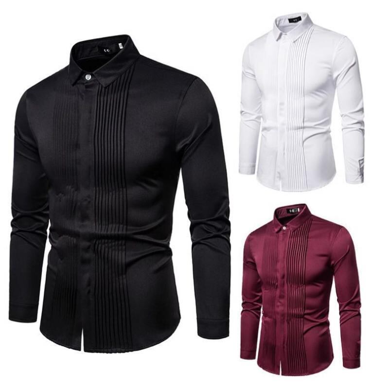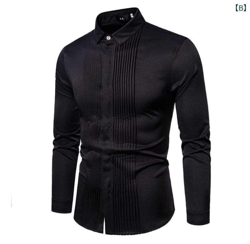 シャツ メンズ 長袖 襟付き スリムフィット ブリティッシュスタイル プリーツ ポリエステル 綿混 男性用 ユニフォーム フォーマル ビジネス カジュアル デイリーユース