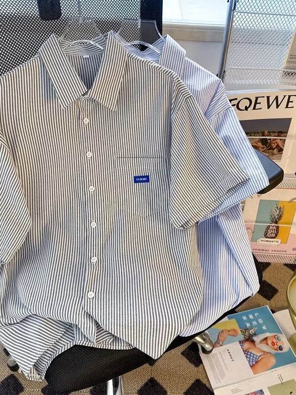 開襟シャツ メンズ 五分袖 ストライプ柄 薄手 ゆったり ルーズシルエット 和風 クリーン 大人カジュアル 夏服 ポリエステル混紡 シワになりにくい イージーケア 丈夫 耐久性 ブルー系 グレー系 普段使い デイリーユース カジュアルウェア