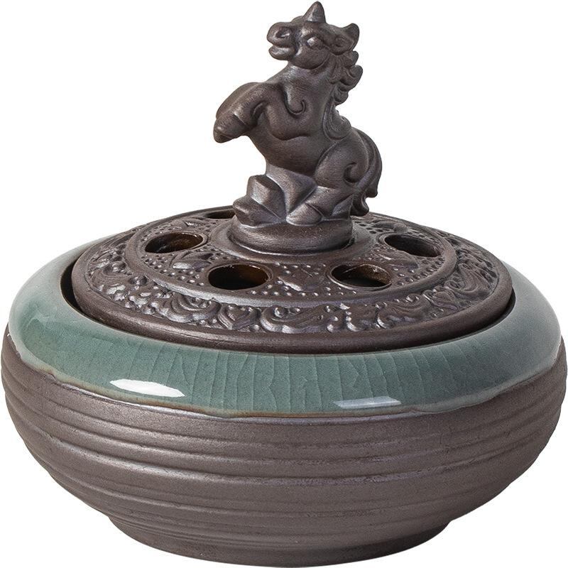 香炉 小型 陶器製 家庭用 室内用 馬モチーフ 祥雲柄 開運 招福 縁起物 お香立て 線香立て 渦巻香 スティック香 コーン香対応 レトロ 和風 アンティーク調 インテリア 癒し 瞑想